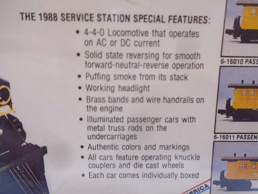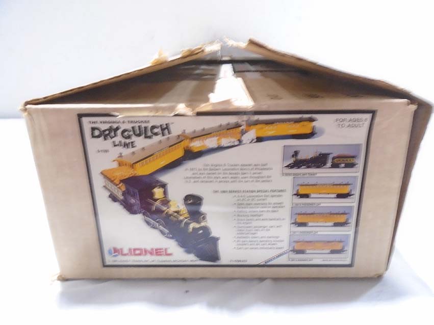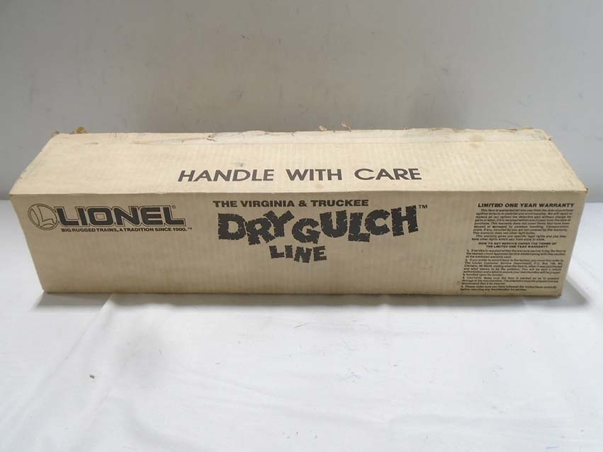 This is the #11706 Dry Gulch Service Station Special Passenger Set that Lionel made in the late 1980s. This Set includes the #18702 Virginia & Truckee 4-4-0 General Steam Engine and Tender with Magnetraction and Smoke, the #16012 Virginia & Truckee Baggage, the #16010 Virginia & Truckee Coach and the #16011 Virginia & Truckee Coach. Our Opinion is that the Set is generally in Like New Condition. Original Boxes. All Original in our Opinion. Please add $45.00 for US-48 Shipping and Insurance (more west of the Mississippi).