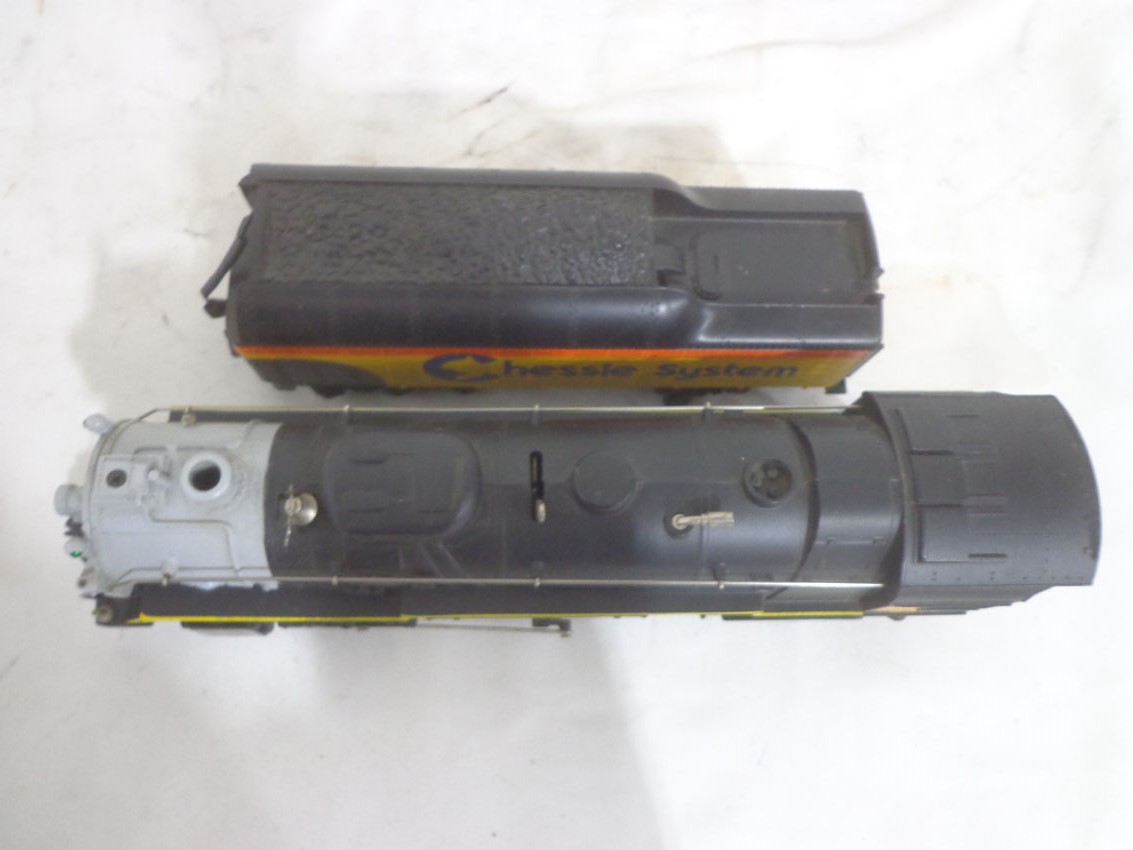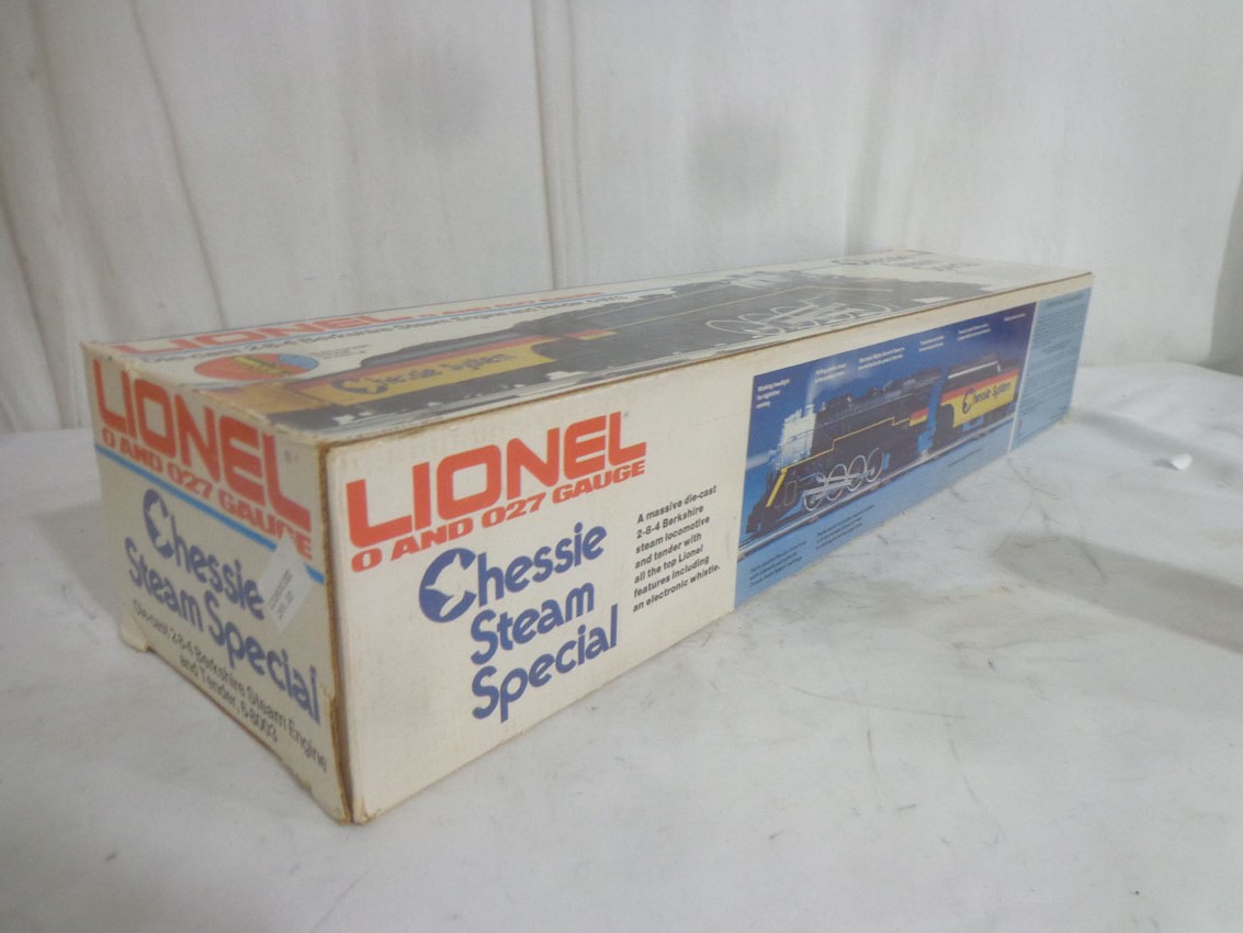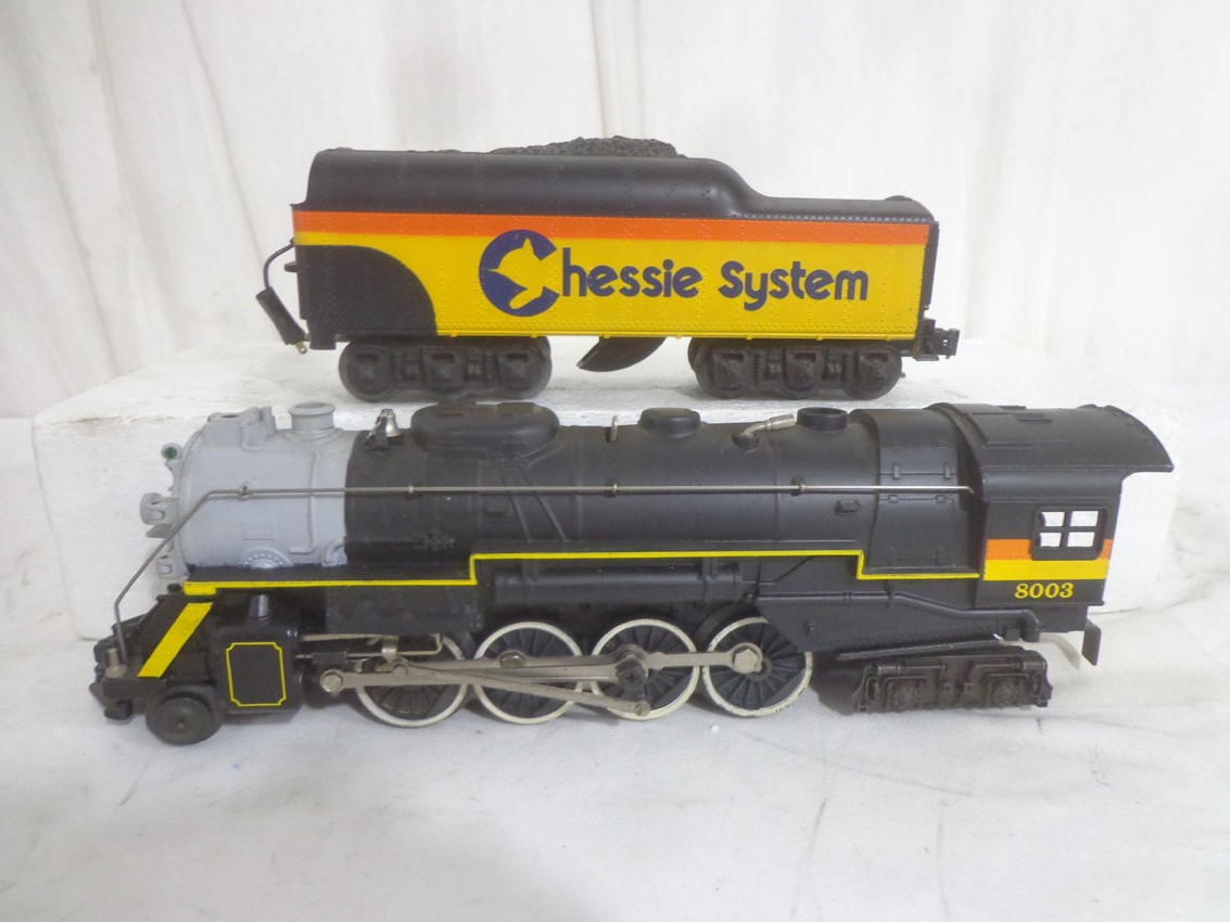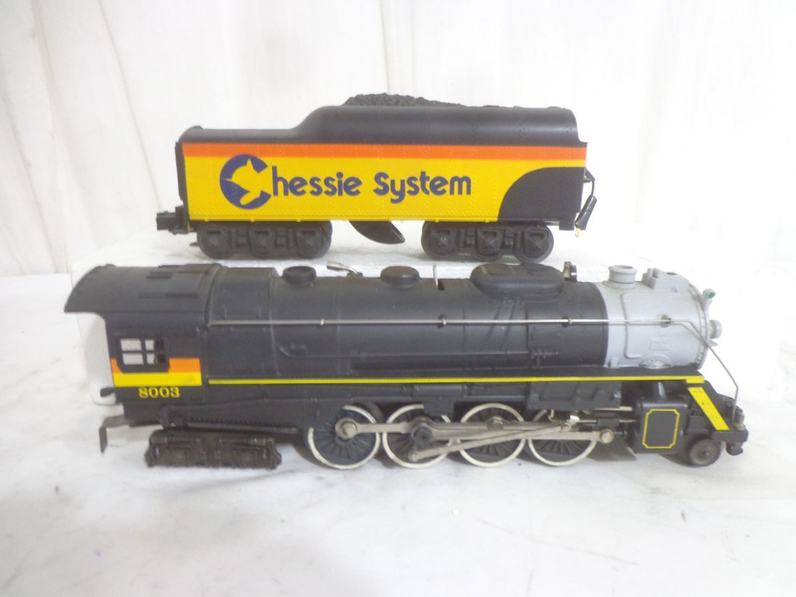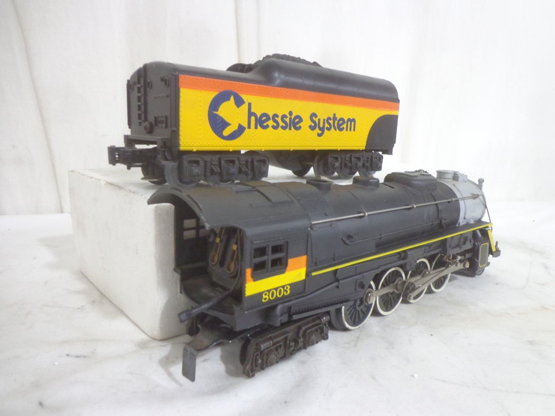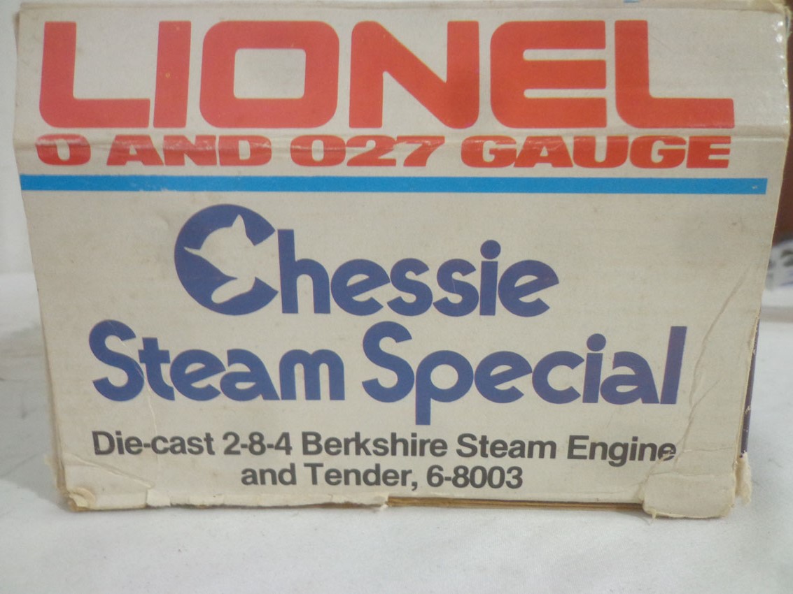 This is the #8003 Chessie Steam Special Train Set that Lionel made in the later 1970s. Included are the #8003 Chessie 2-8-4 Berkshire Steam Engine and Tender and #9581/9582/9583/9584/9585/9586 Passenger Cars. Our Opinion is that they are generally in Like New Condition. Original Boxes. All Original in our Opinion. Please add $50.00 for US-48 Shipping and Insurance (more west of the Mississippi).