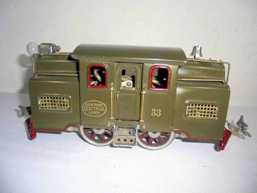 This is the #33 Dk Olive Green Electric Locomotive (windows/cow catchers may be repainted) that Lionel made in Standard Gauge in the 1920s. No Box. Examine closely; what is pictured is what you will receive. Please add $35.00 for US-48 Shipping and Insurance (more west of the Mississippi).