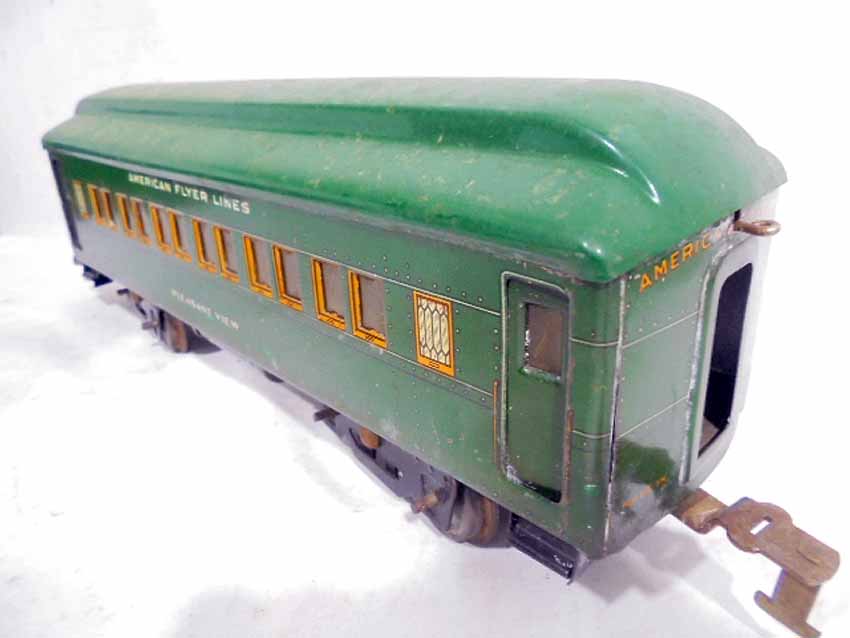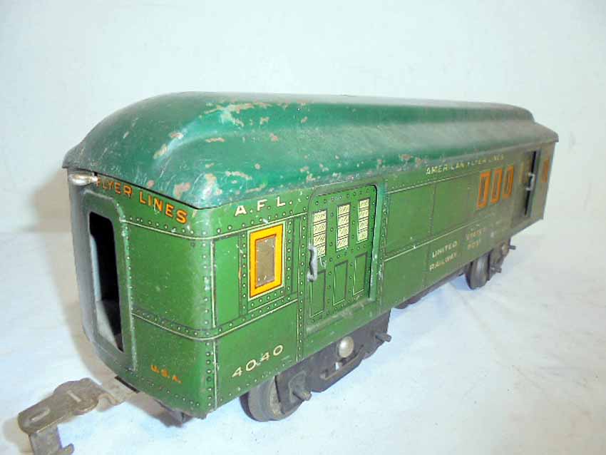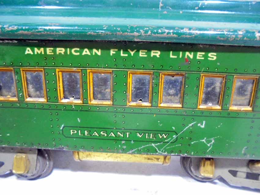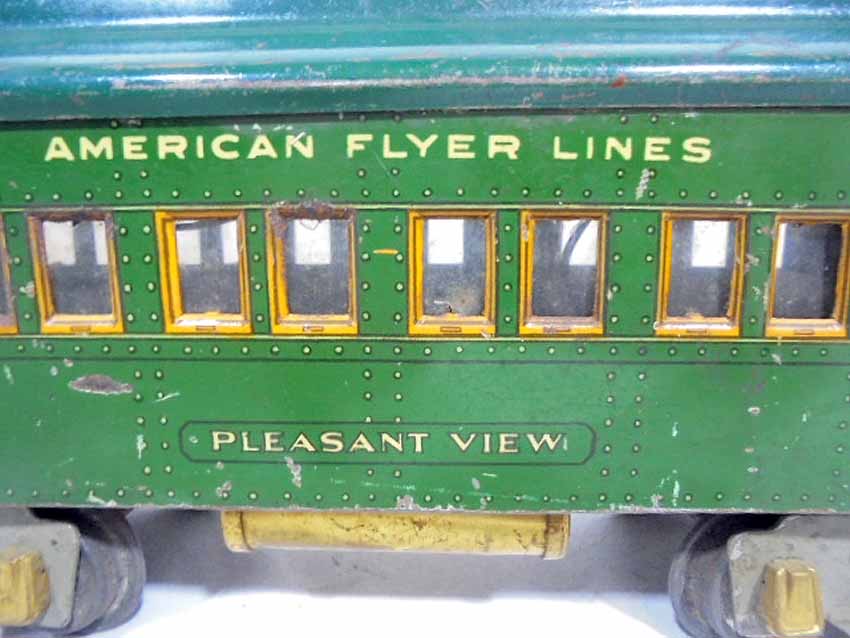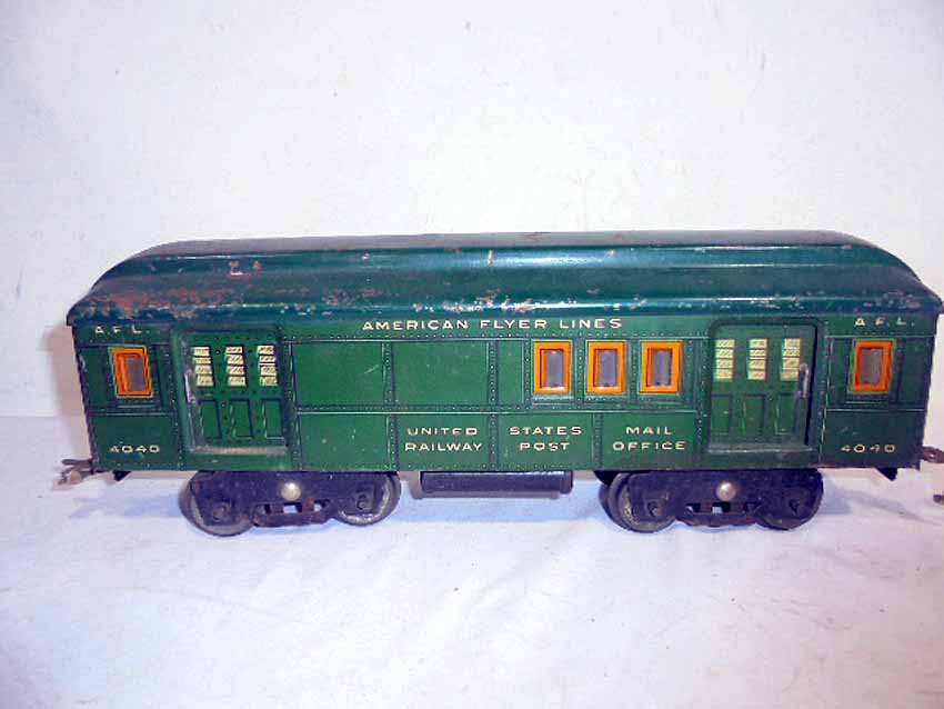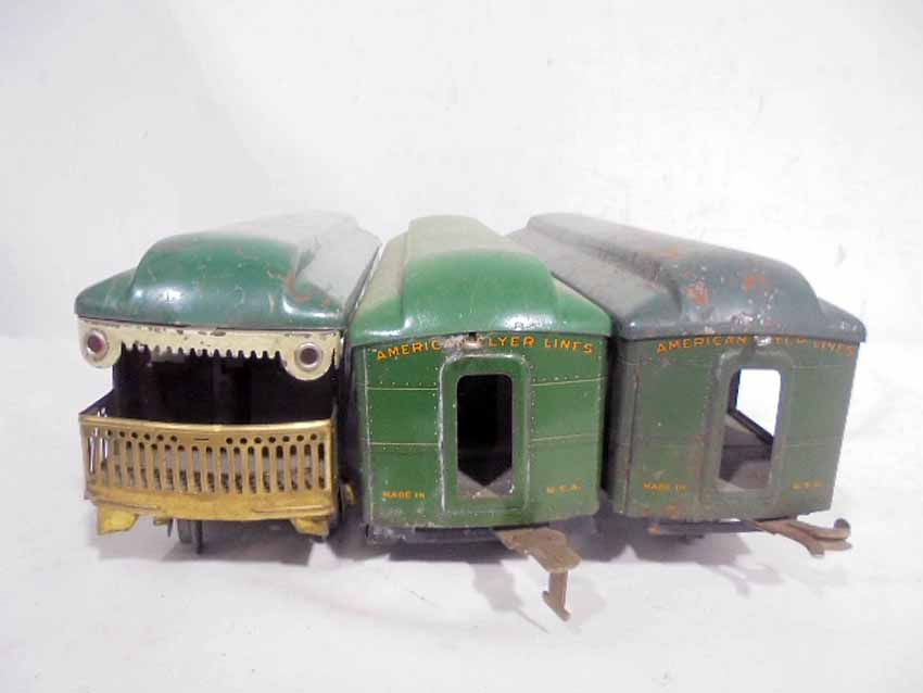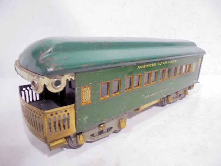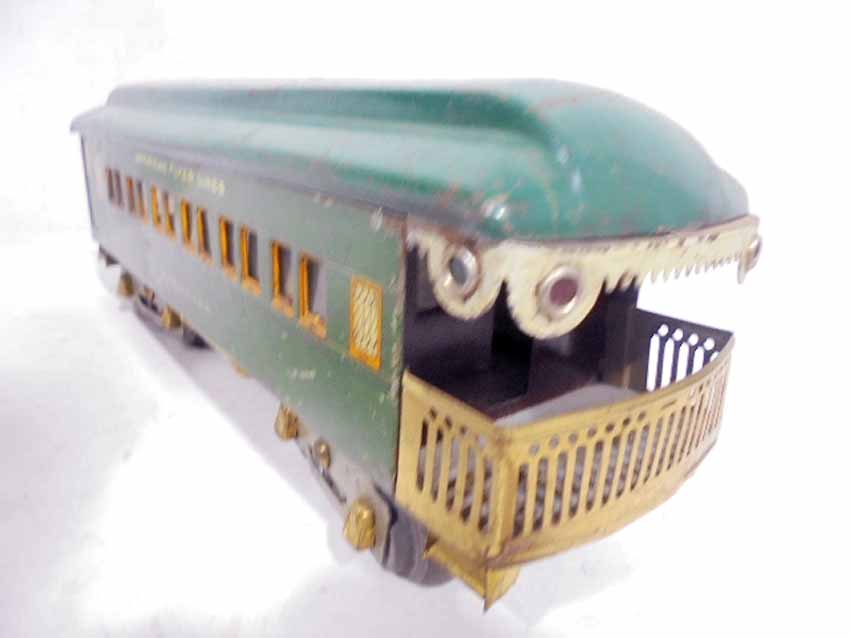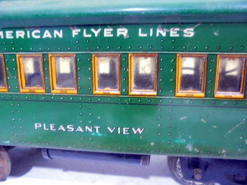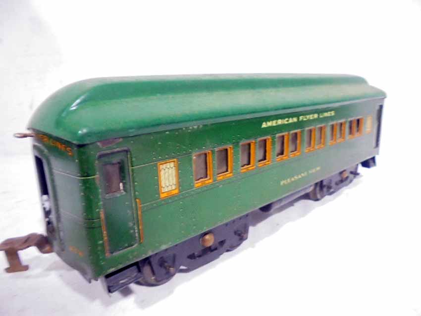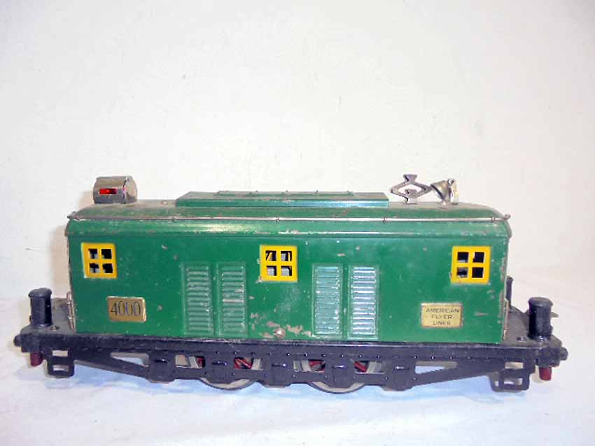 This is the American Flyer Wide Gauge #7038 Uncatalogued Set made 1928. Includes #4000 Electric Engine, #4040 Baggage, #4041 Pullman and #4042 Observation Car(Restored). No Box. Examine closely; what is pictured is what you will receiver. Please add $50.00 for US-48 Shipping and Insurance (more west of the Mississippi).