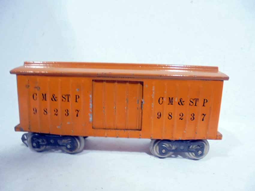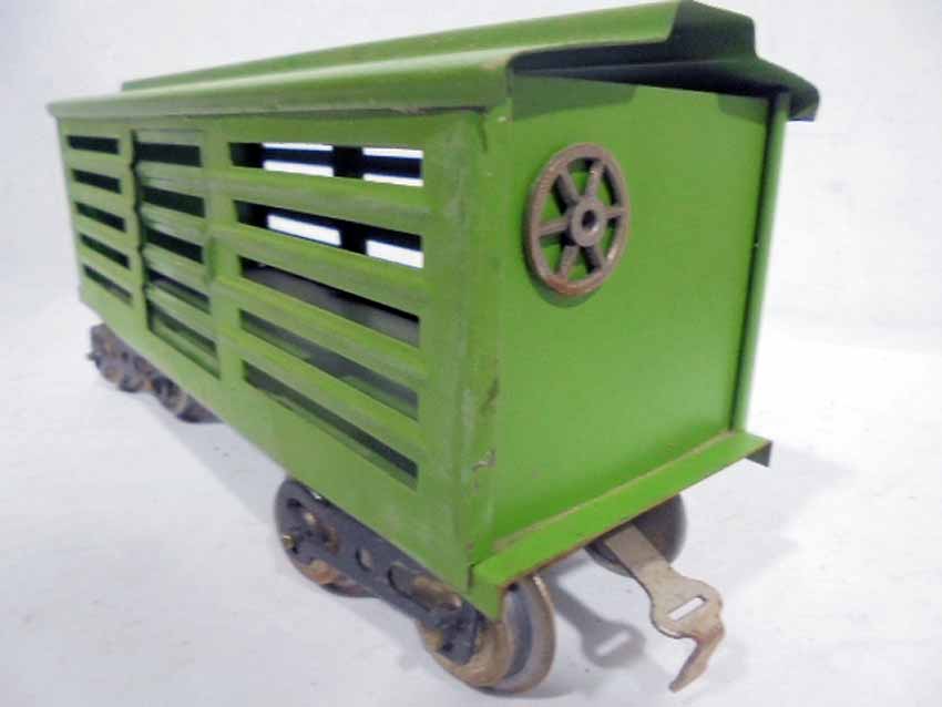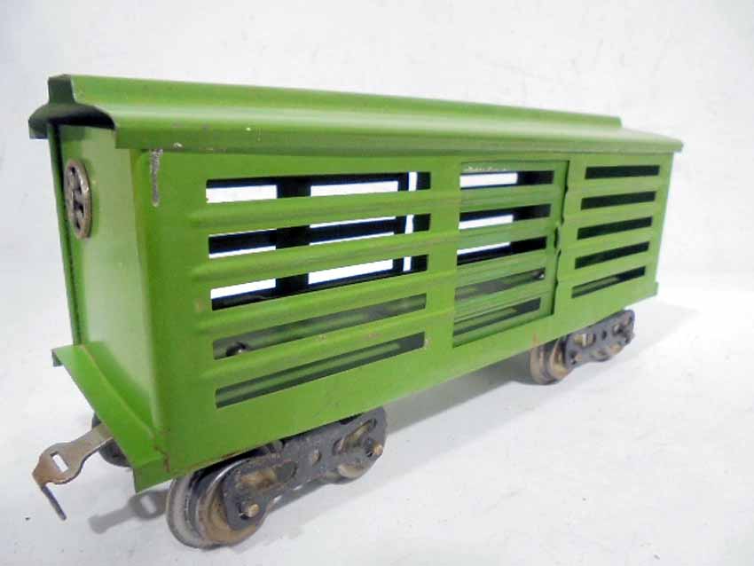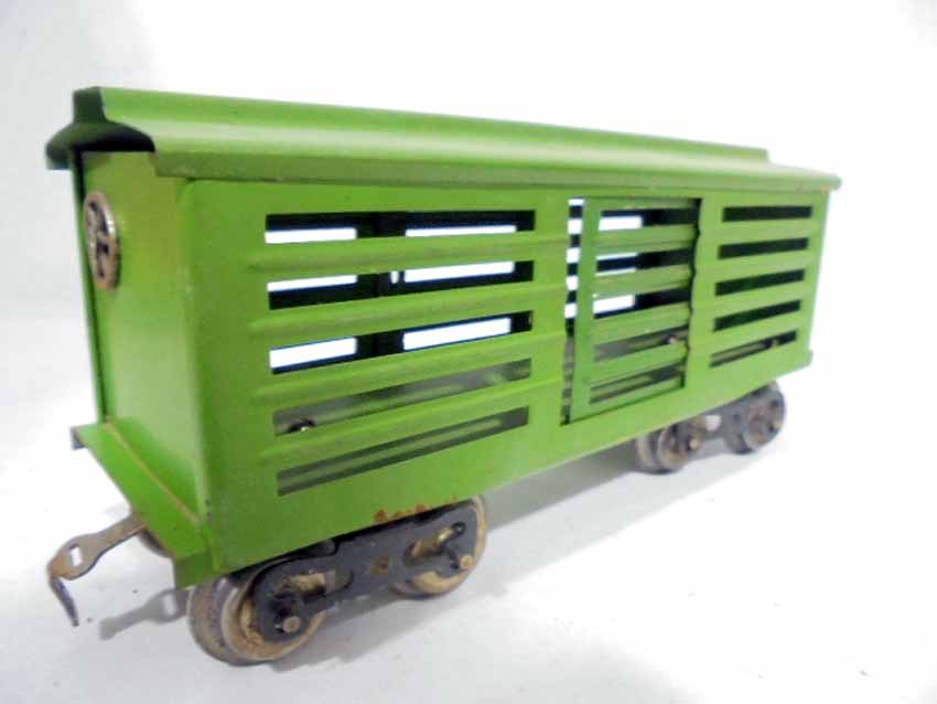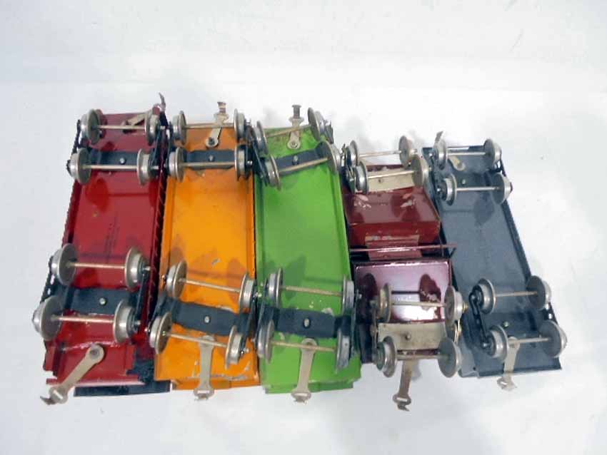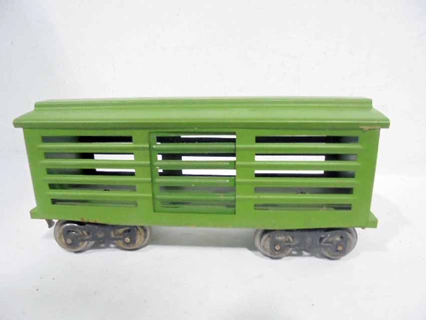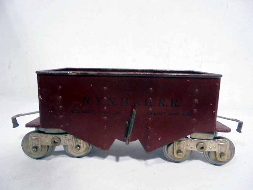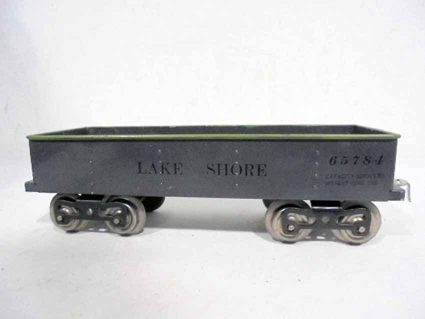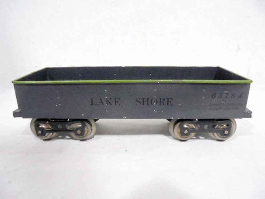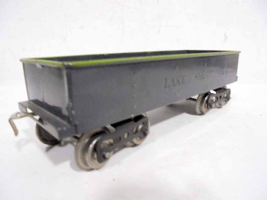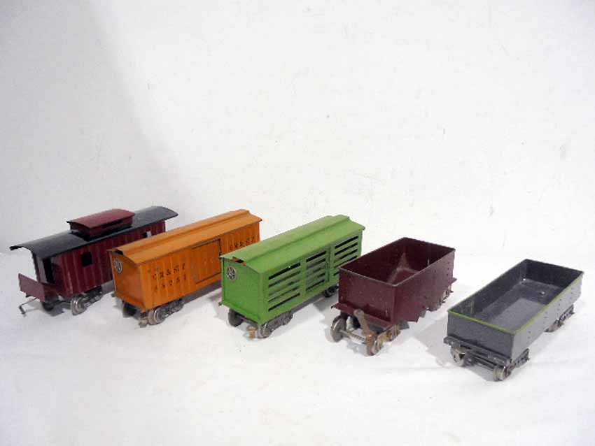 Lionel Standard Gauge #112 Lake Shore Gondola, #113 Green Stock Car, #114 CM&St P Box Car, #117 NYC & HRRR Caboose, and #116 NYNH & HRR Ballast Hopper