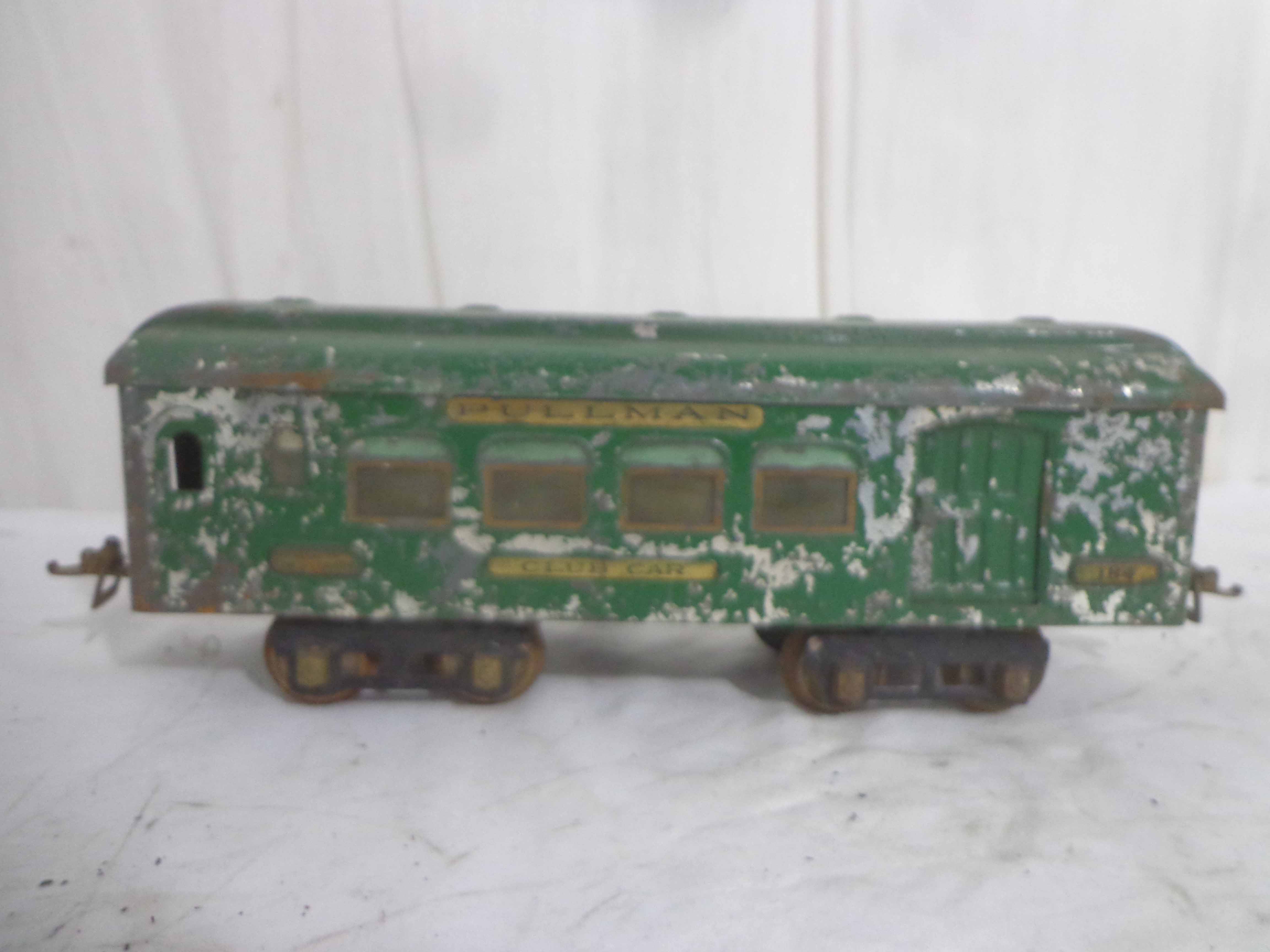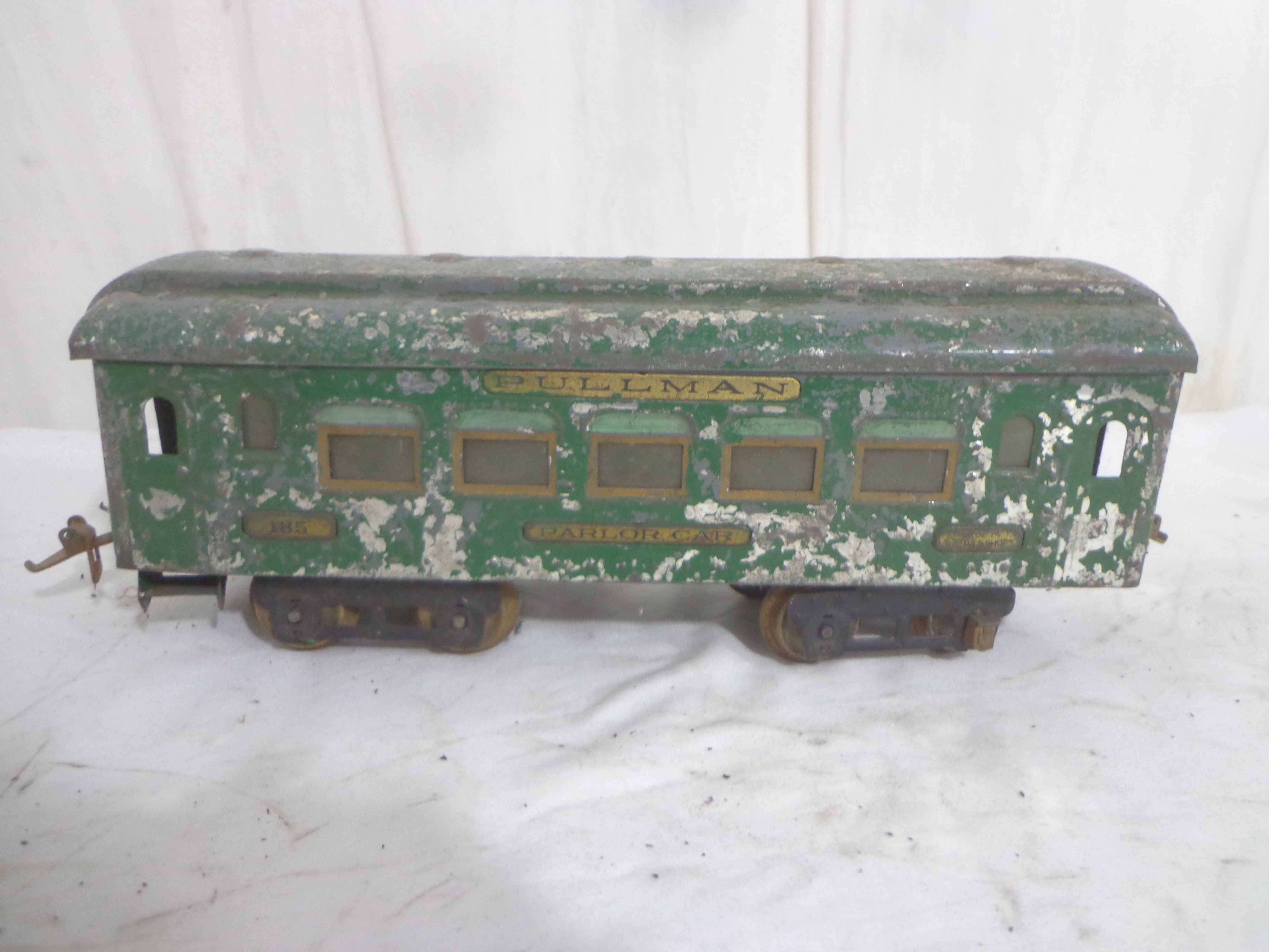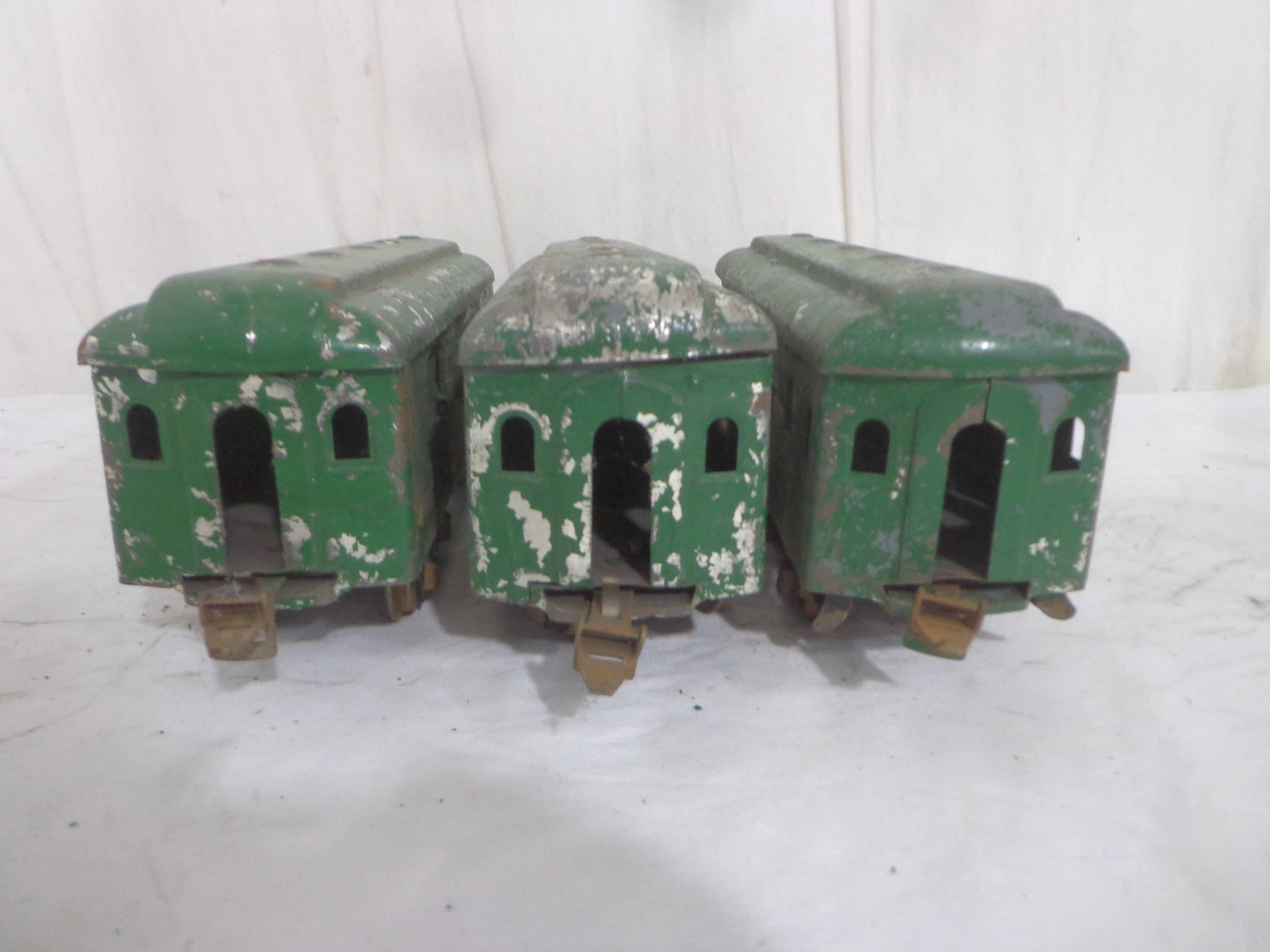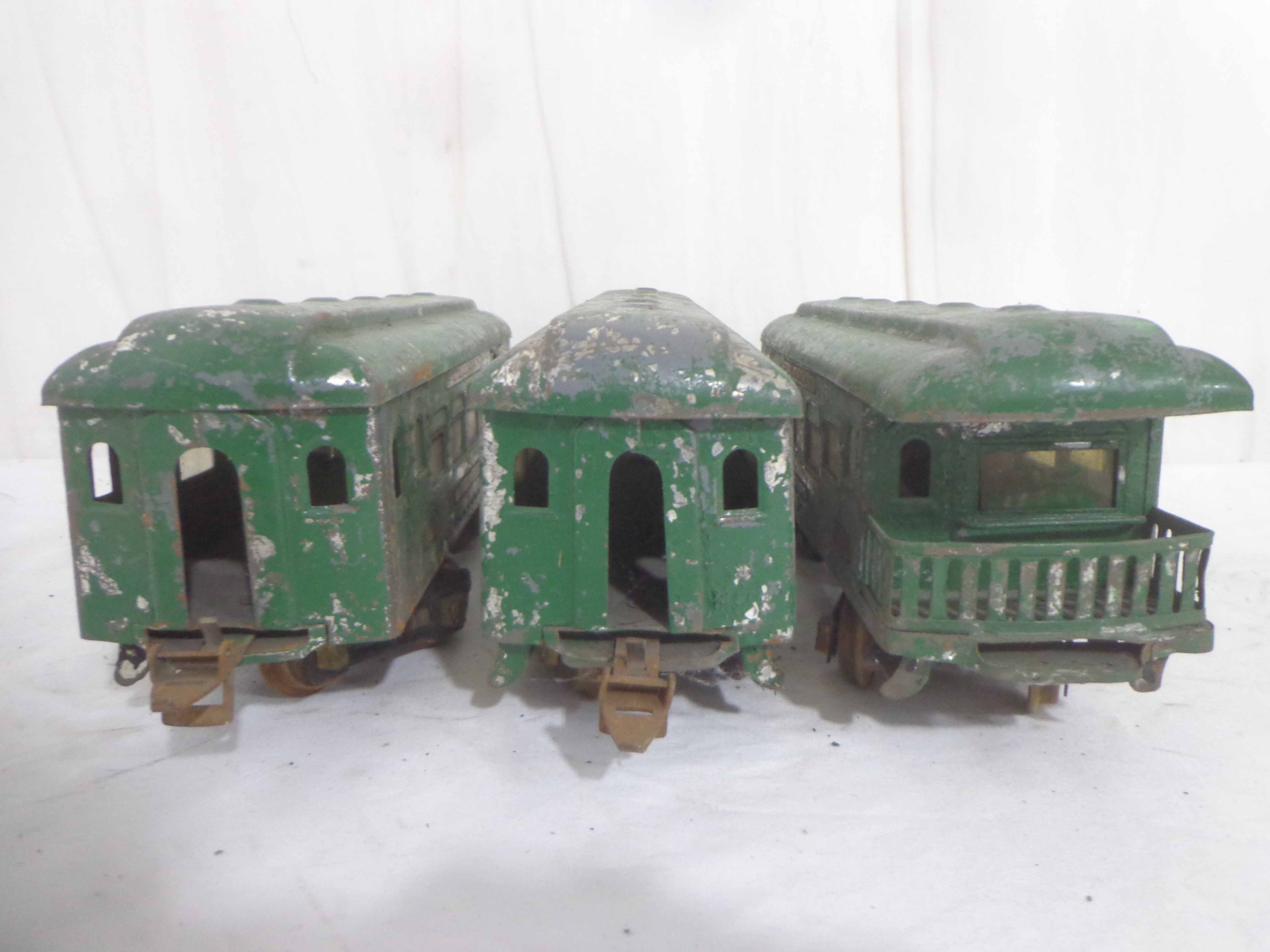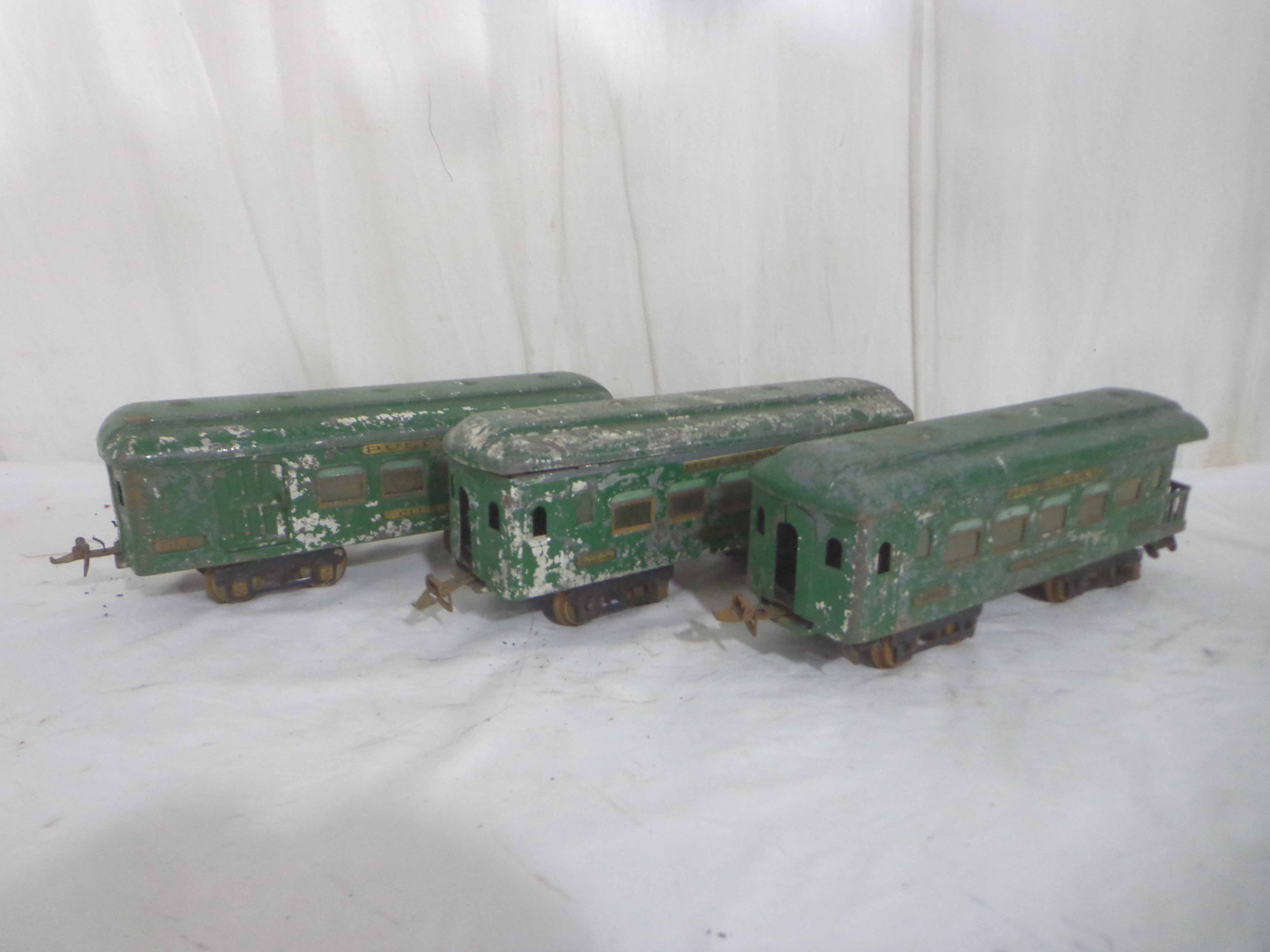 These are Ives Wide Gauge #184/185/186 Passenger Cars from the 1920s. No Boxes. Examine very closely; what is pictured is what you will receive. Please add $40.00 for US-48 Shipping and Insurance (more west of the Mississippi). |