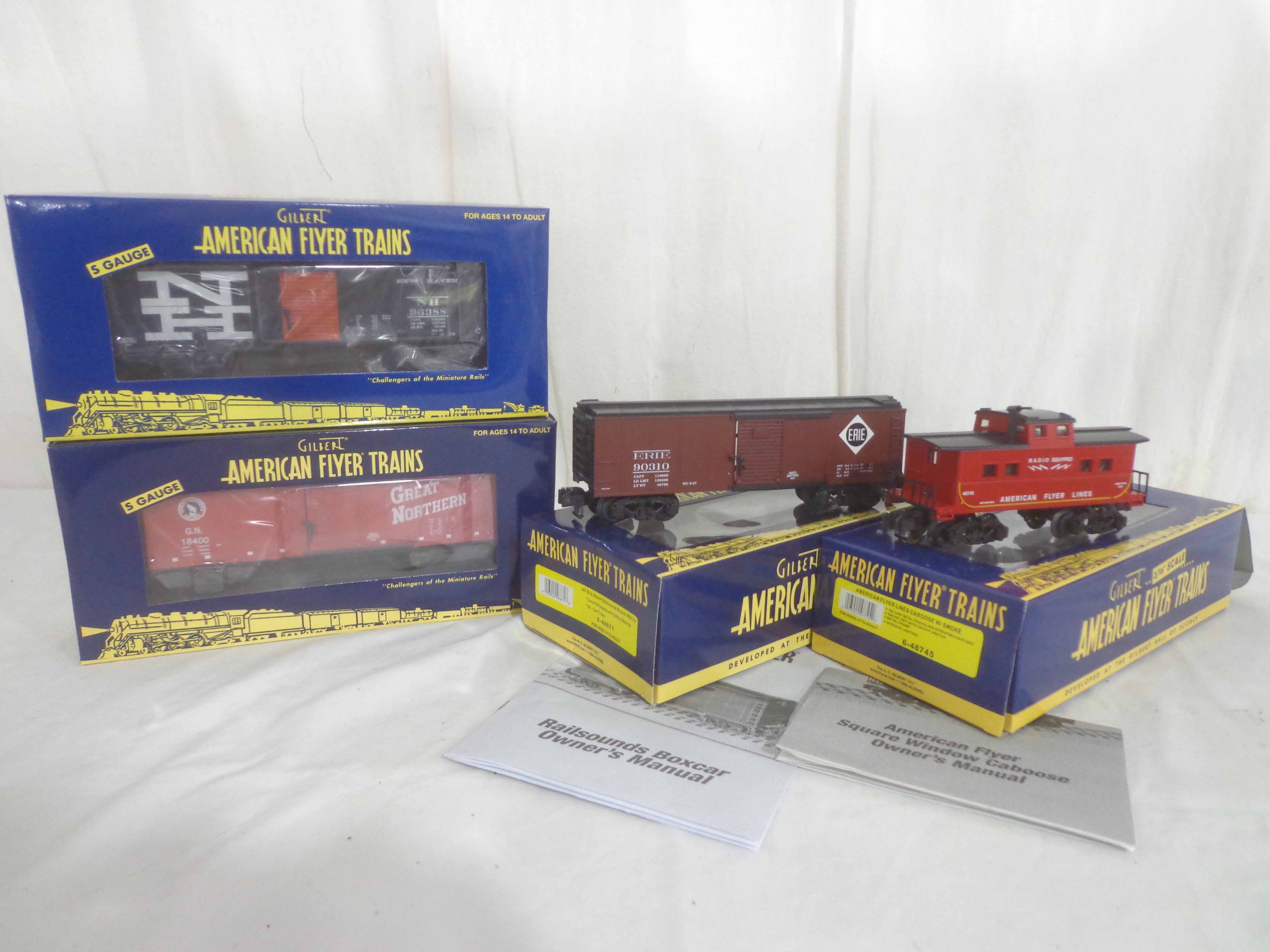 | Lot 13 | AF/Lionel S Gauge: #48870 Great Northern Steam Railsounds Box Car, #48871 Erie Steam Railsounds Box Car, #49064 New Haven Steam Railsounds Box Car and #48745 AF Caboose/OBs |