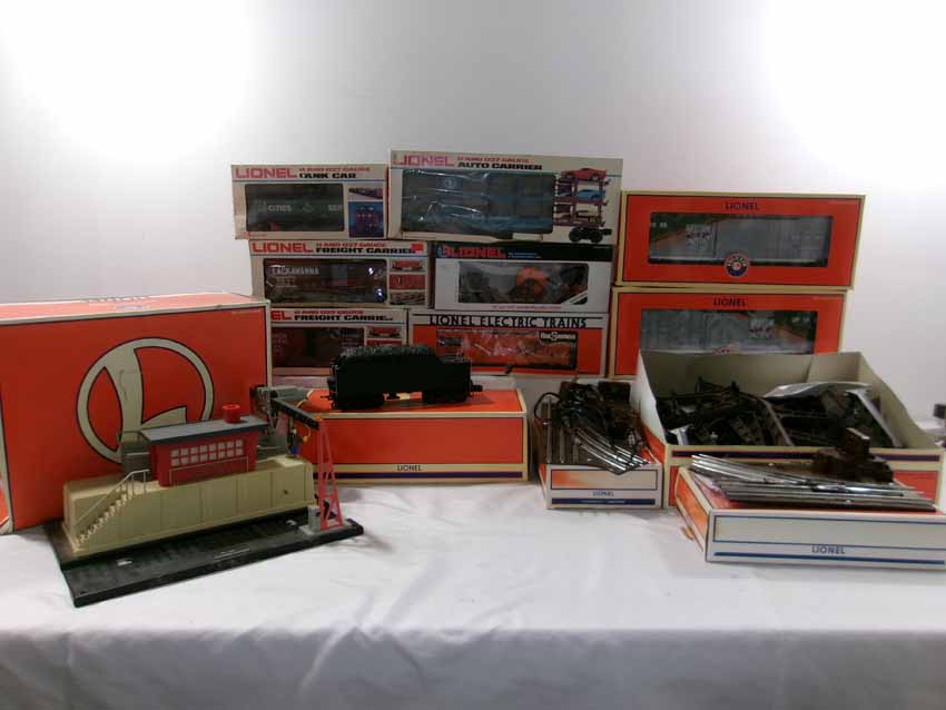 | Lot 174 | Lionel #19833 Railsounds Tender, #22965 Culvert Loader, #12754 Trestle Set, #65022 RH Manual 027 Switch #65121 LH Remote 027 Switch and 8 Assorted Freight Cars/OBs |