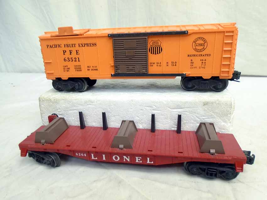 These are the #264 Operating Fork Lift (Car missing stakes) and #352 Operating Icing Set w/Car that Lionel made in the later 1950s. Original Box. Examine closely; what is pictured is what you will receive. Please add $35.00 for US-48 Shipping and Insurance (more west of the Mississippi).