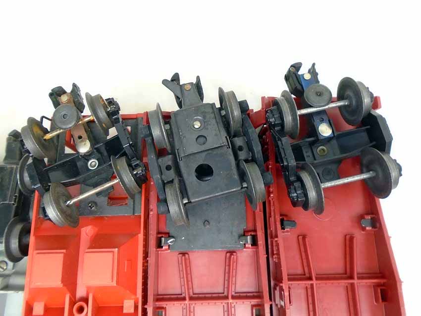 These are the #6571 Depressed Flat Car w/Cable Reels, #6436 Hopper, #6672 Reefer and two #6414 Autoloader Cars (all Vehicles Original) that Lionel made in the 1950s. No Boxes. Examine very, very closely; what is clearly pictured is what you will receive. Please add $45.00 for US-48 Shipping and Insurance (more west of the Mississippi). |