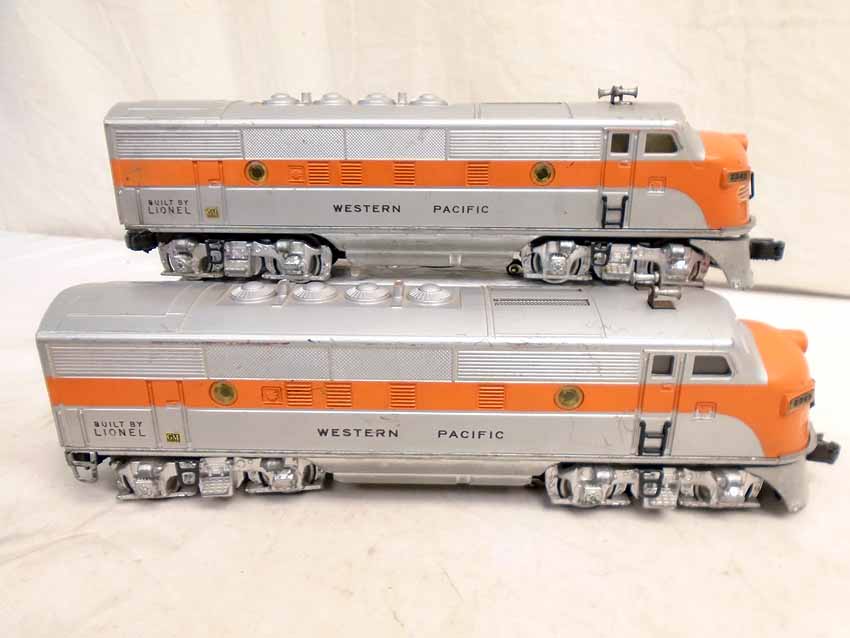 These are the #2345P/T Western Pacific F-3 AA Locomotive (Rough Decals) that Lionel made in the early 1950s. Dual Motors, Horn, and Magnetraction. Our Opinion is that they are generally in Very Good Plus Condition. No Boxes. All Original in our Opinion. Examine very closely; what is pictured is what you will receive. Please add $50.00 for US-48 Shipping and Insurance (more west of the Mississippi).