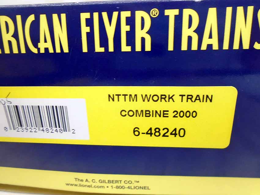 This is the NTTM Work Train Set that Lionel/American Flyer made in S Gauge several years ago for the TCA. finished outside the factory. Included are #48240 2000 Combine Car, #48223 2001 Tank Car, #48230 Gondola (1977), #48254 2004 Wrecking Crane, #48226 Flat Car (1957), #48234 2003 Box Car and #48247 2002 Work Caboose. Original Boxes. Examine closely; what is pictured is what you will receive. Please add $40.00 for US-48 Shipping and Insurance (more west of the Mississippi).