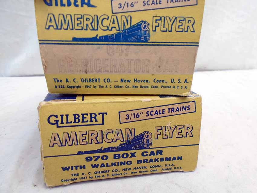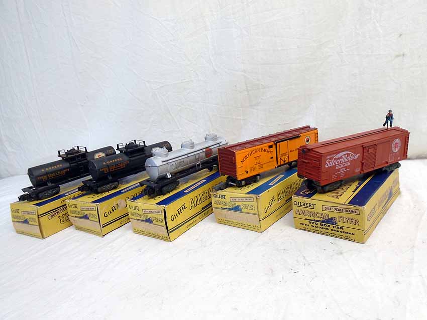 Nice AF S Gauge: #970 Box Car w/Walking Brakeman, #647 Refrigerator Car, #926 3 Dome Tank car, and 2 #912 Chemical Tank Car/OBs