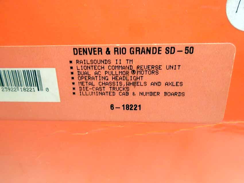 This is the #18221 Denver & Rio Grande (5517) SD-50 Diesel that Lionel made a few years ago. Features Railsounds and Dual Motors. Our Opinion is that it is generally in Like New Plus Condition. Original Box. All Original in our Opinion. Please add $35.00 for US-48 Shipping and Insurance. |