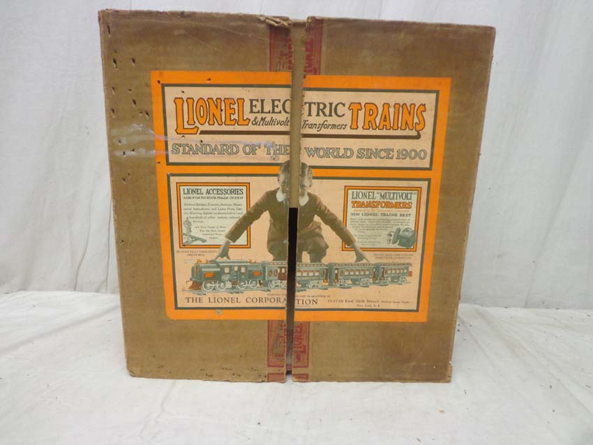 This is the Lionel Standard Gauge #41E Freight Set circa 1926. Included are the #318 Electric Engine, #112 Rock Island Gondola, #113 Stock Car, #114 CM&STP Box Car, #116 NY, NH&NHH Ballast Car (scarce Gray), and the #117 NY, NH&NHH Caboose (no track). Original Set Box, unique with flaps on top, and Inner Boxes as shown. Examine closely; what is pictured is what you will receive. Please add $80.00 for US-48 Shipping and Insurance (more west of the Mississippi). |