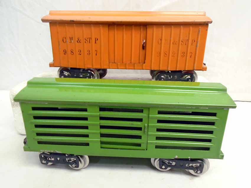This is the #351E Passenger Set that Lionel made in Standard Gauge 1925-26. Includes the #8E Olive Green Electric Engine, #112 Grey Gondola, #117 Maroon Caboose, #81 Rheostat and Extra Cars #114 Orange box Car & #113 Green Cattle Car. Largest 8E Set. Original Boxes/(weak/tattered/Set Box as shown. Examine very closely; what is pictured is what you will receive. Please add $75.00 for US-48 Shipping and Insurance (more west of the Mississippi).