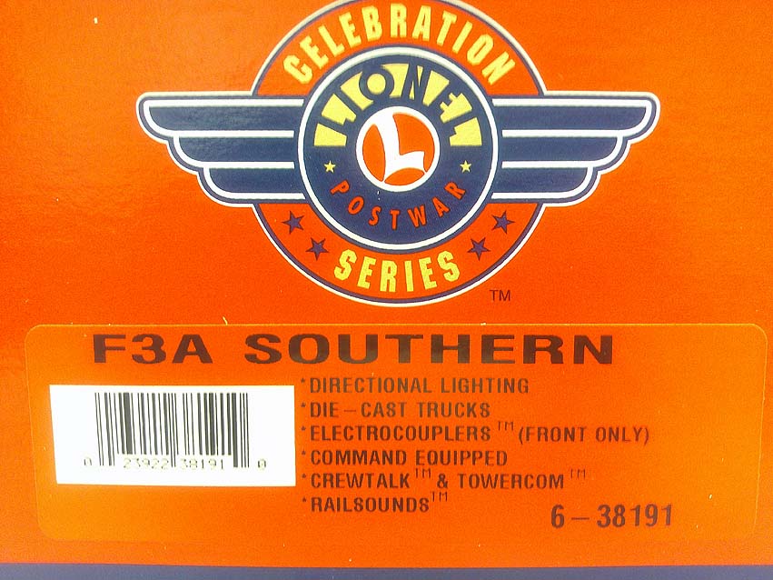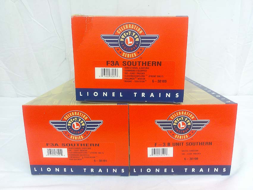 These are the #38118 Southern F-3 ABA Diesels Locomotive Set that Lionel made a few years ago in its PostWar Celebration Series. These Diesels are individually numbered (38189, 38190 and 38191) and feature Dual Pullmor motors in powered unit, Command controlled, RailSounds with TowerCom and CrewTalk, Durable die-cast frames, trucks and pilots, Detailed molded bodies, Magne-Traction, Operating headlights and interiors, Directional lighting, ElectroCouplers on noses, Fixed couplers at rear, Metal ladders, Finished cab interior with engineer and brakeman figures and Postwar Celebration Series builders plaques. Minimum Radius is 0-31 and the length of the ABA set is 39 1/2." Our Opinion is that they are in Like New Condition. Original Box. All Original in our Opinion. Please add $45.00 for US-48 Shipping and Insurance (more west of the Mississippi).