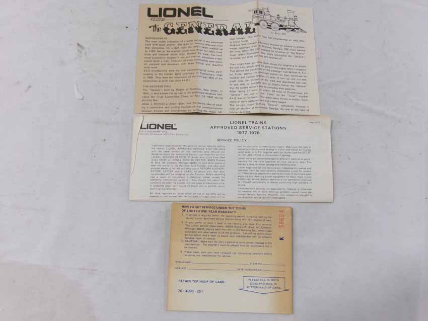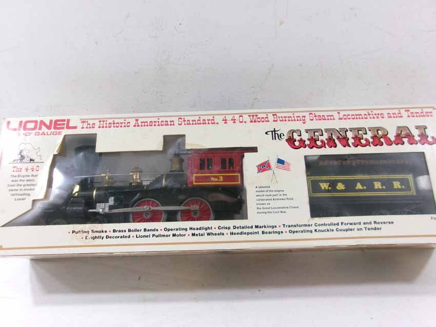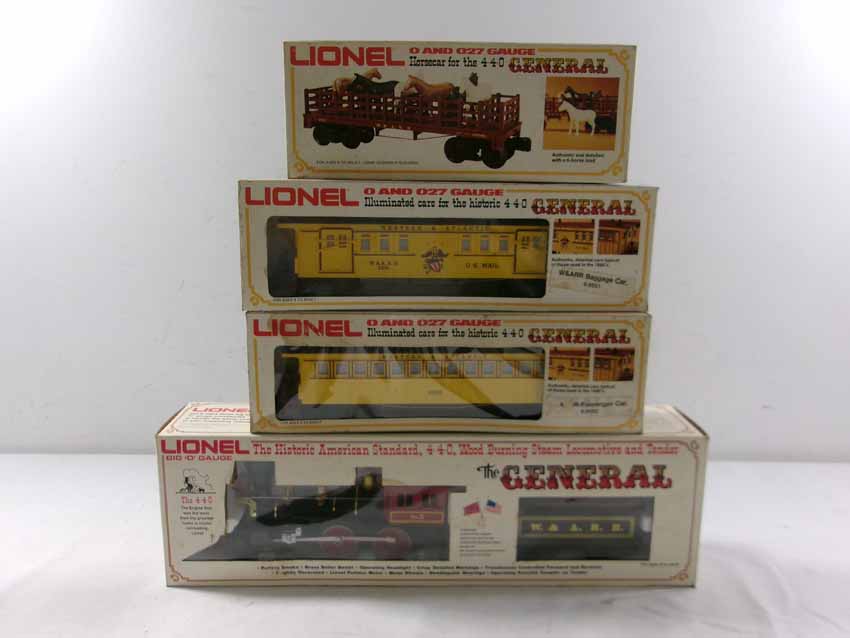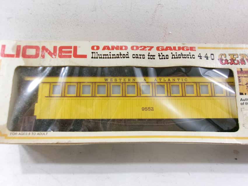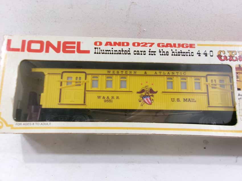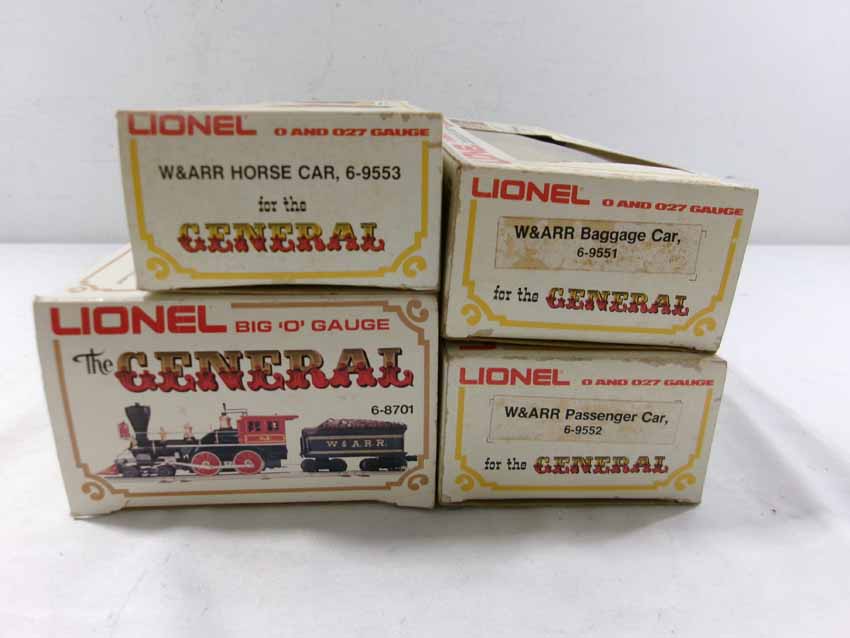 These are the #8701 W&A 4-4-0 General Steam Engine & Tender, #9551 W&A Baggage Car, #9552 W&A Coach, and #9553 W&A Horse Flat Car that Lionel madein the 1970s. Our Opinion is that they are generally in Like New Condition. Original Boxes. All Original in our Opinion. Please add $40.00 for US-48 Shipping and Insurance (more west of the Mississippi).