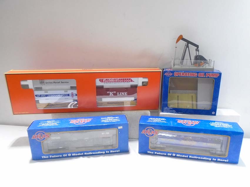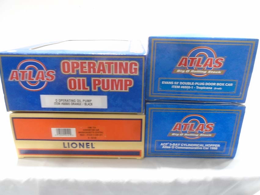 These are the Lionel/Atlas #52142 1998 TCA Convention 2-Car Set, #66905 Operating Oil Pump, #6505-1 Tropicana Box Car and #? Cylindrical Hopper Car that Lionel made a few years ago. Our Opinion is that they are generally in Like New Condition. Original Boxes. All Original in our Opinion. Please add $50.00 for US-48 Shipping and Insurance (more west of the Mississippi).