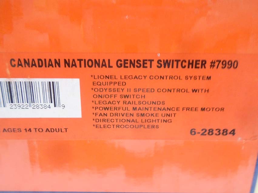 This is the #28384 CN Genset Diesel Switcher Engine (legacy & railsounds) that Lionel made a few years ago. Our Opinion is that it is generally in Like New Condition. Original Box. All Original in our Opinion. Please add $45.00 for US-48 Shipping and Insurance (more west of the Mississippi).