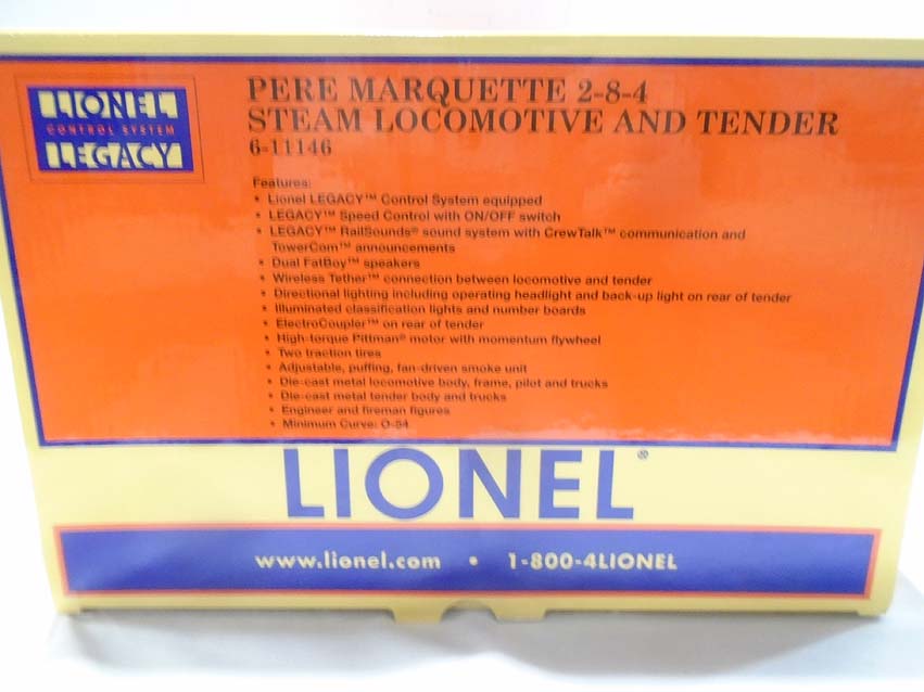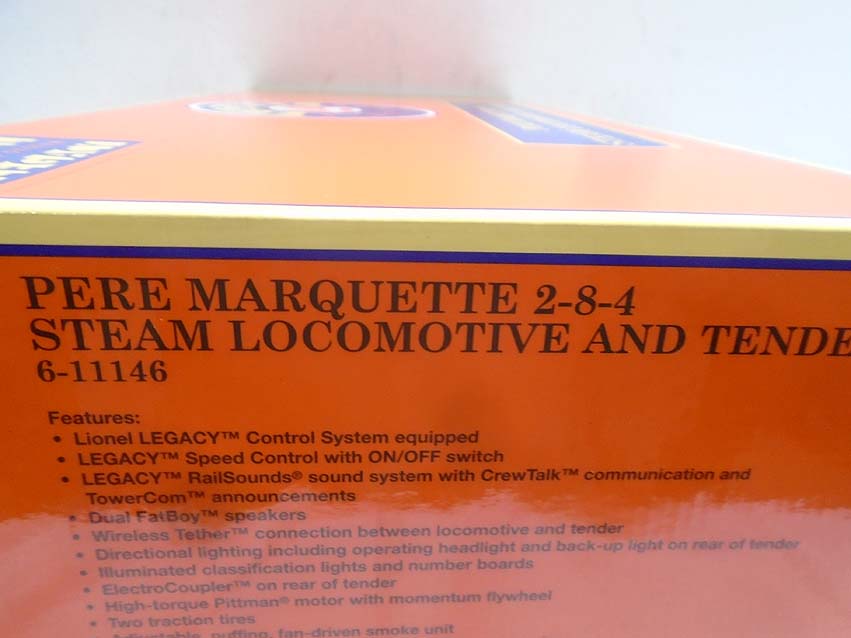 These are the #11146 Pere Marquette 2-8-4 Berkshire Steam Engine & Tender that Lionel made circa 2008. Features Legacy Command Control, Railsounds, the Odyssey System II, Wireless Tether, and Electrocoupler. Our Opinion is that they are generally in Like New Condition. Original Box. All Original in our Opinion. Please add $50.00 for US-48 Shipping and Insurance (more west of the Mississippi). |