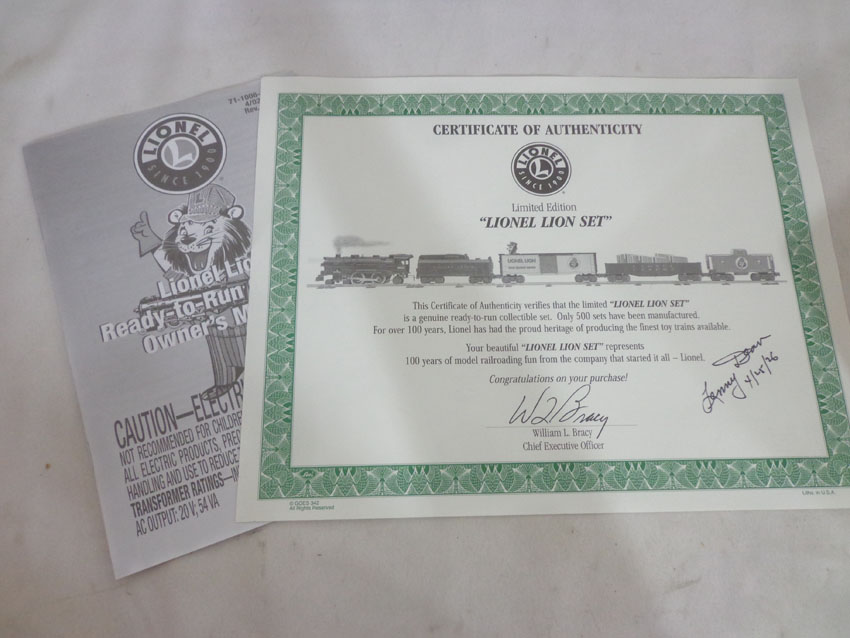 This is the #11006 Lionel Lion Train Set (personally signed by Lenny Dean) that Lionel made a few years ago. Our Opinion is that the Set is generally in Mint Condition. Original Box. All Original in our Opinion. Please add $50.00 for US-48 Shipping and Insurance (more west of the Mississippi).