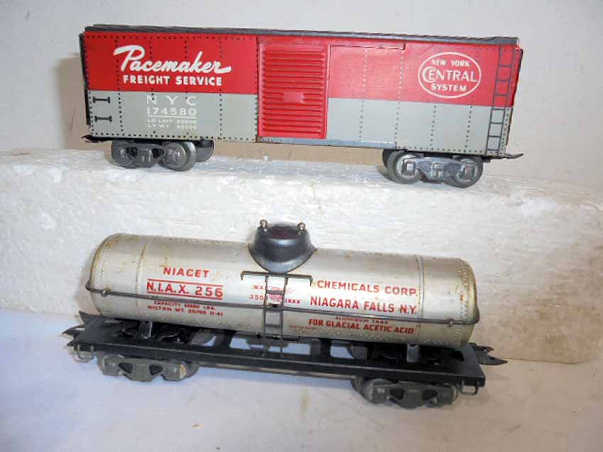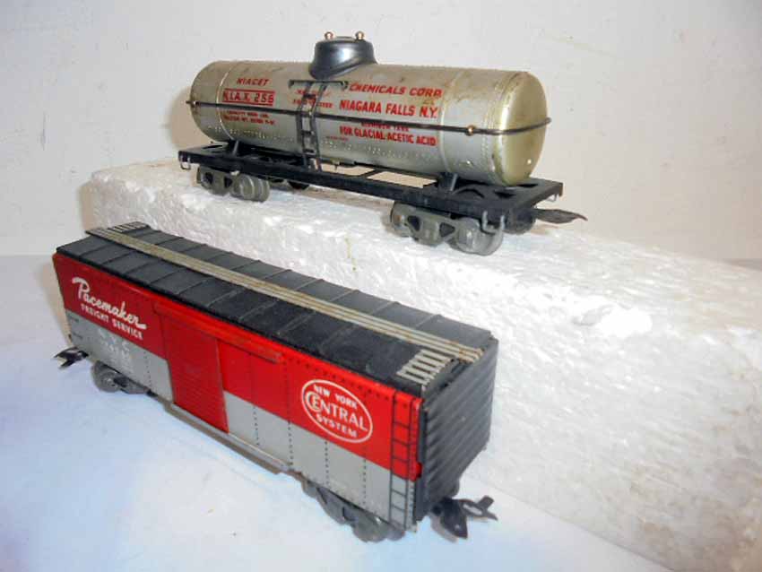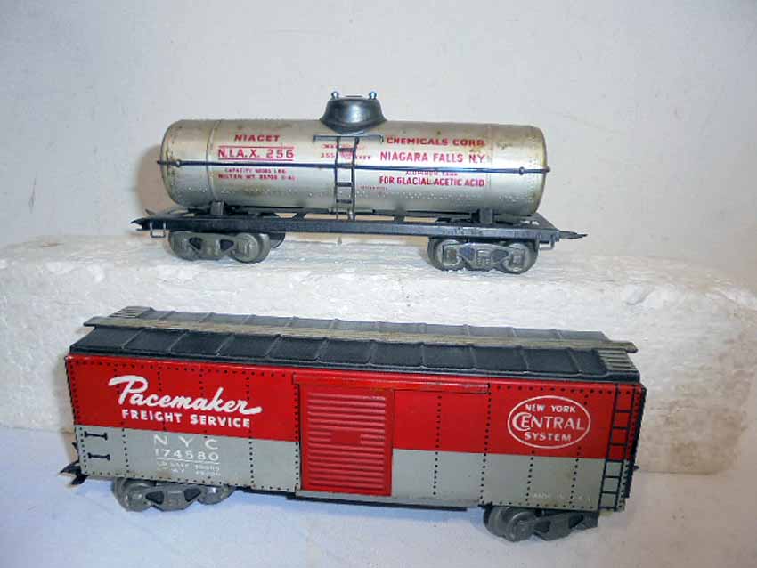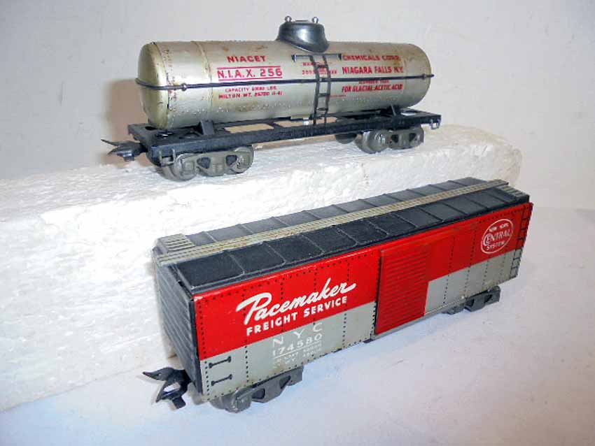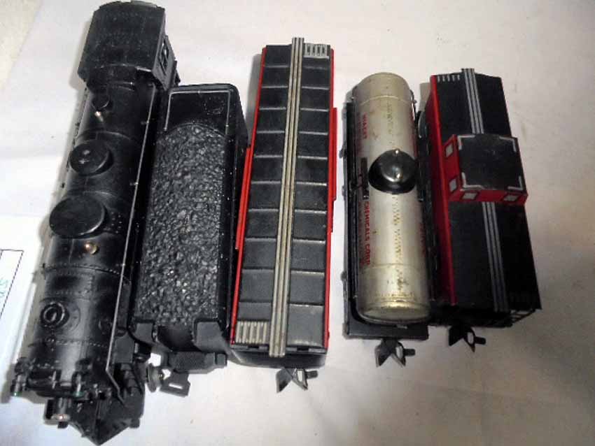 These are the #35200 NYC Freight Train Set that Marx made in the 1950/60s. Inludes NYC Steam Engine & Tender, #Tank Car, Pacemaker Box Car, NYC Caboose, Curved Track and Transformer. Original Box. Examine closely; what is pictured is what you will receive. Please add $45.00 for US-48 Shipping and Insurance. |