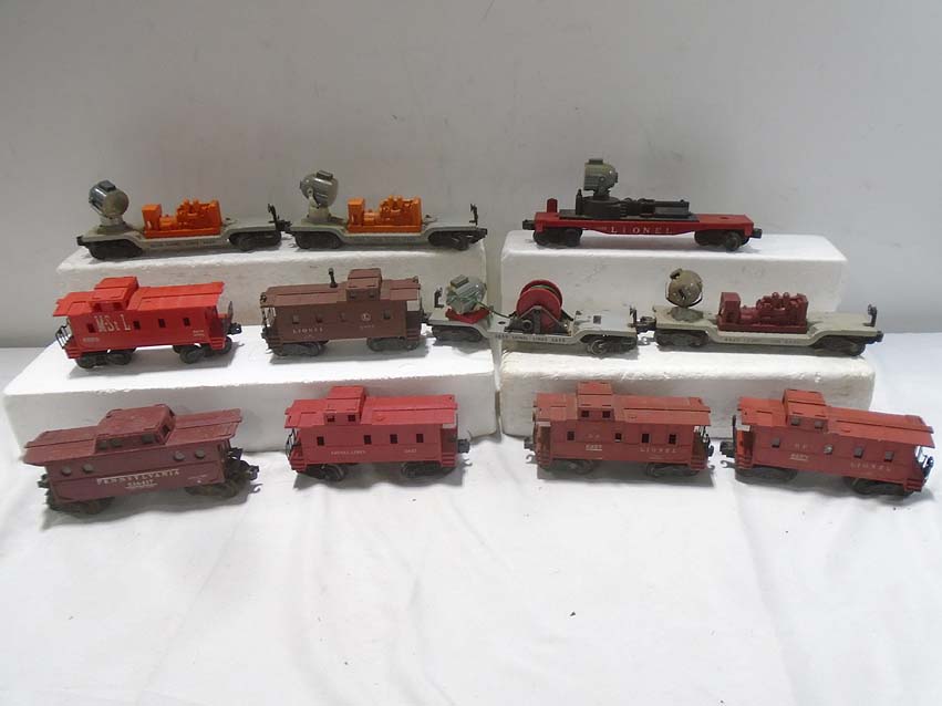 These are eleven Assorted Searchlight Cars and Cabooses that Lionel made in the past. No Boxes. Examine closely; what is pictured is what you will receive. Please add $50.00 for US-48 Shipping and Insurance (more west of the Mississippi).