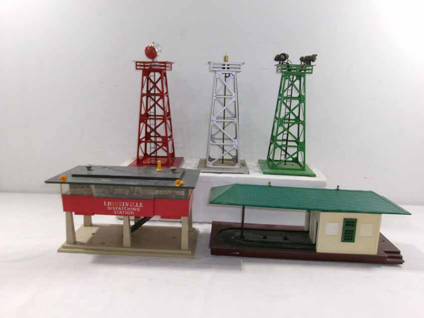 Lionel #465 Operating Dispatching Station, #356 Operating Freight Station, #395 Floodlight Tower, #494 Rotating Beacon and #394 Rotating Beacon