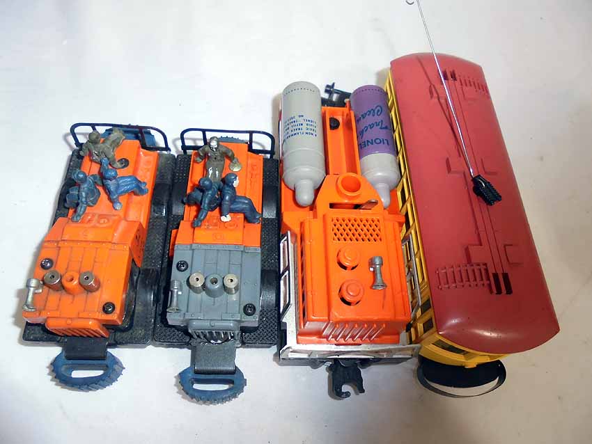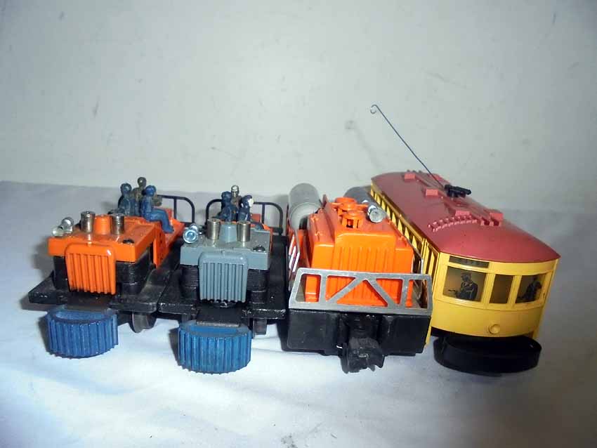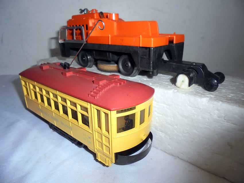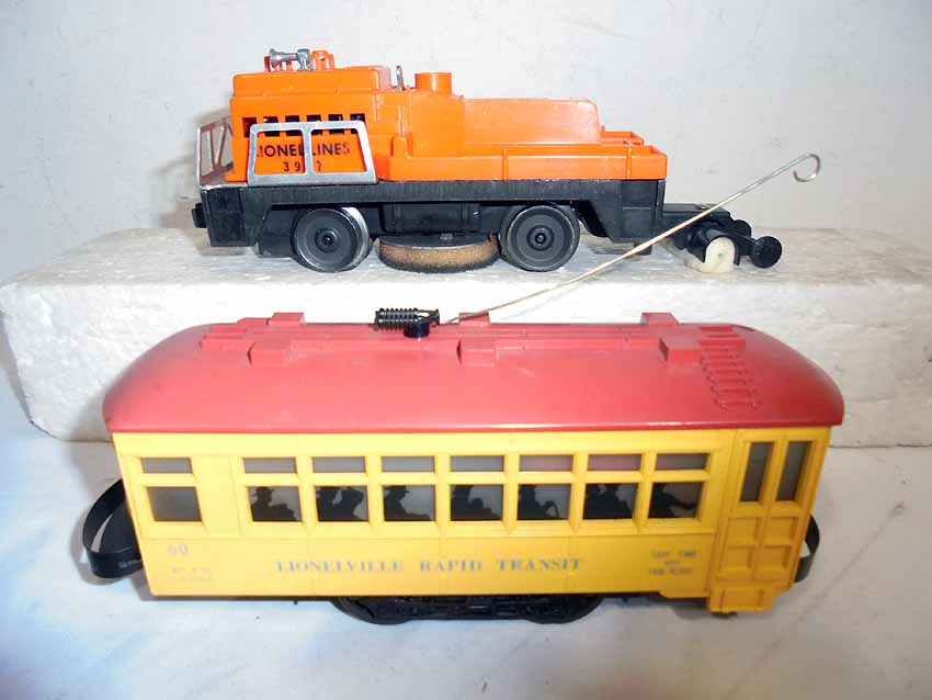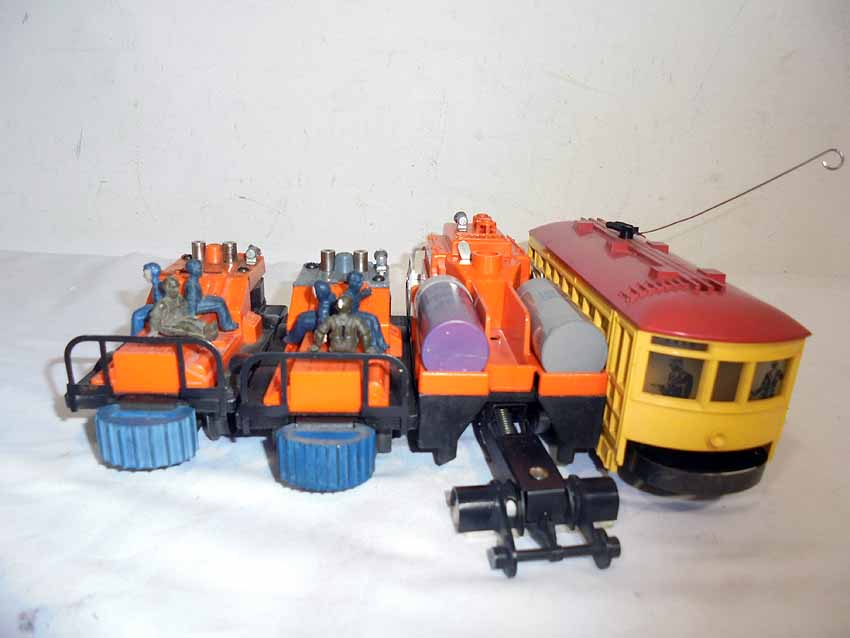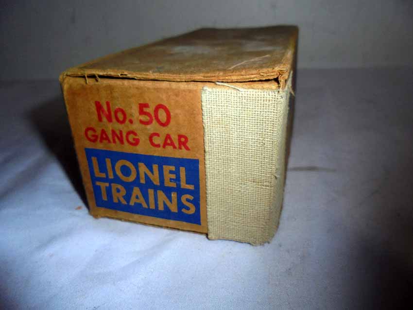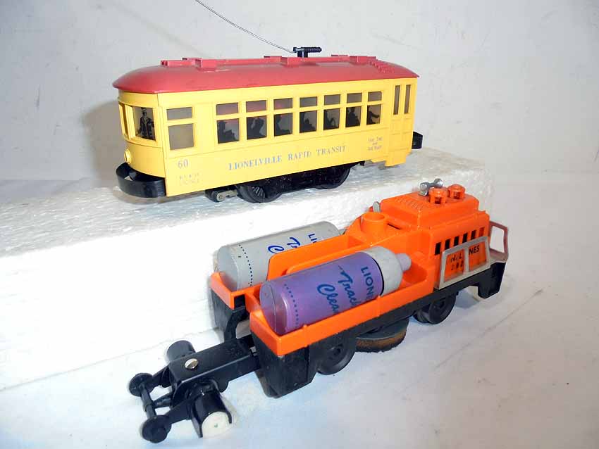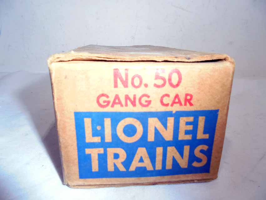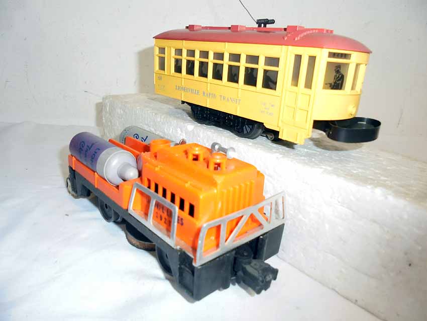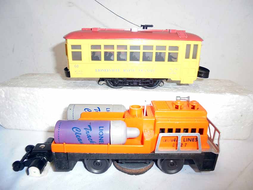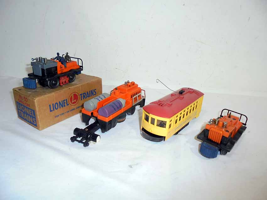 These are two #50 Gang Cars (one Partial Repaint), #3927 Track Cleaning Car (Tubes Repros) and #60 Trolley that Lionel made in the past. Original Box. Examine closely; what is pictured is what you will receive. Please add $50.00 for US-48 Shipping and Insurance (more west of the Mississippi).