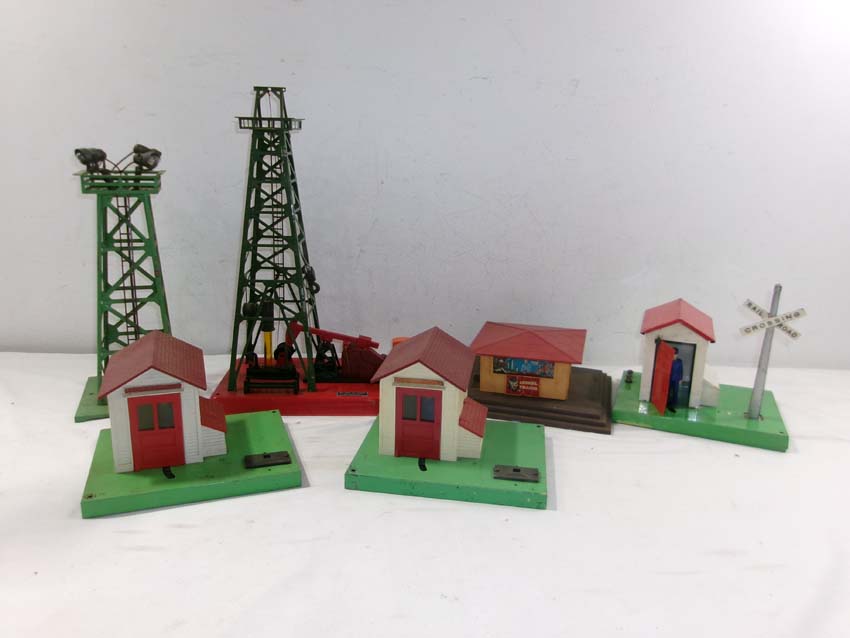 Lionel #45N Automatic Gateman, #114 Newstand w/Horn, #395 Floodlight Tower, 2 #145 Automatic Gatemen and #455 Operating Oil Derrick