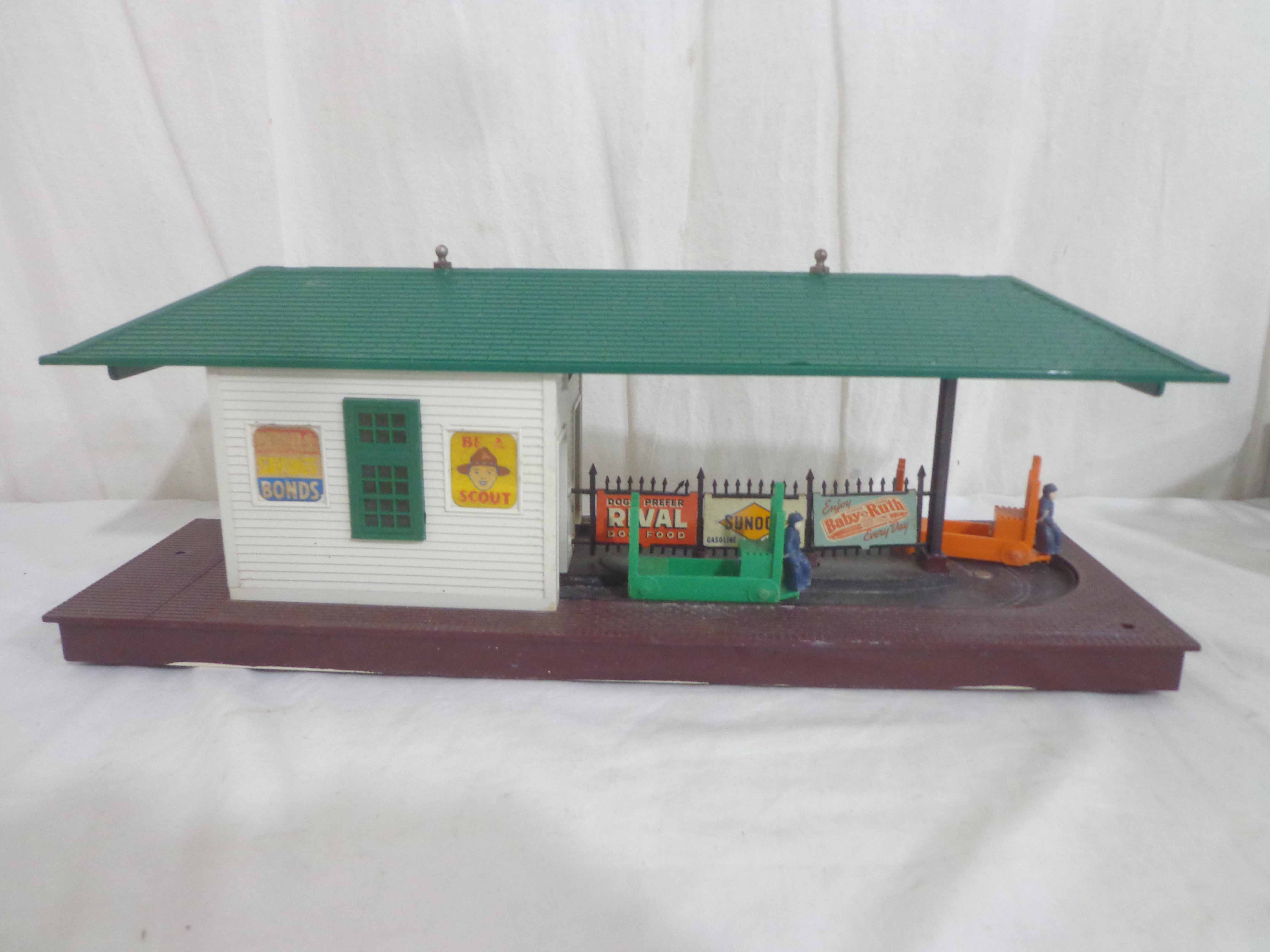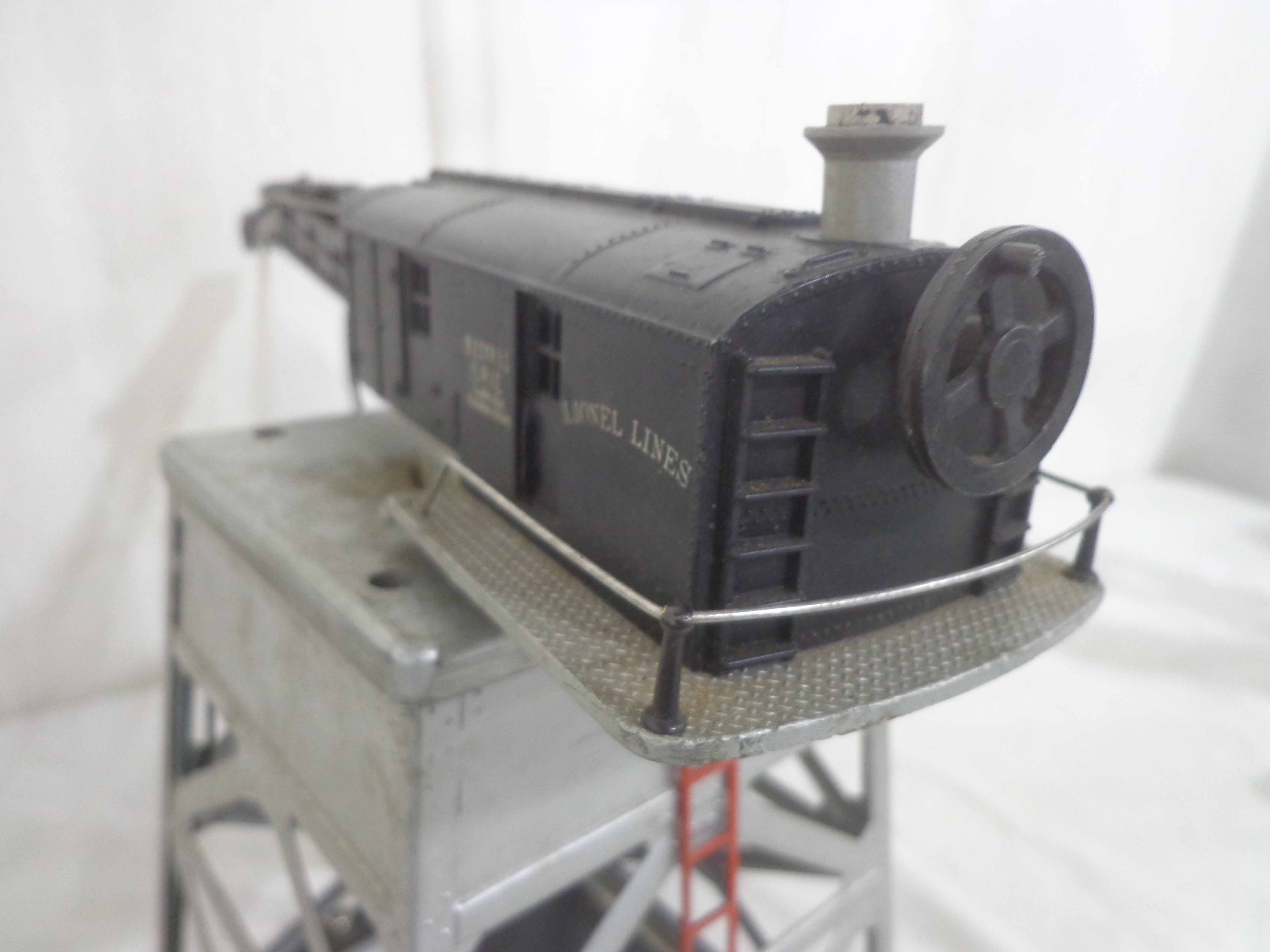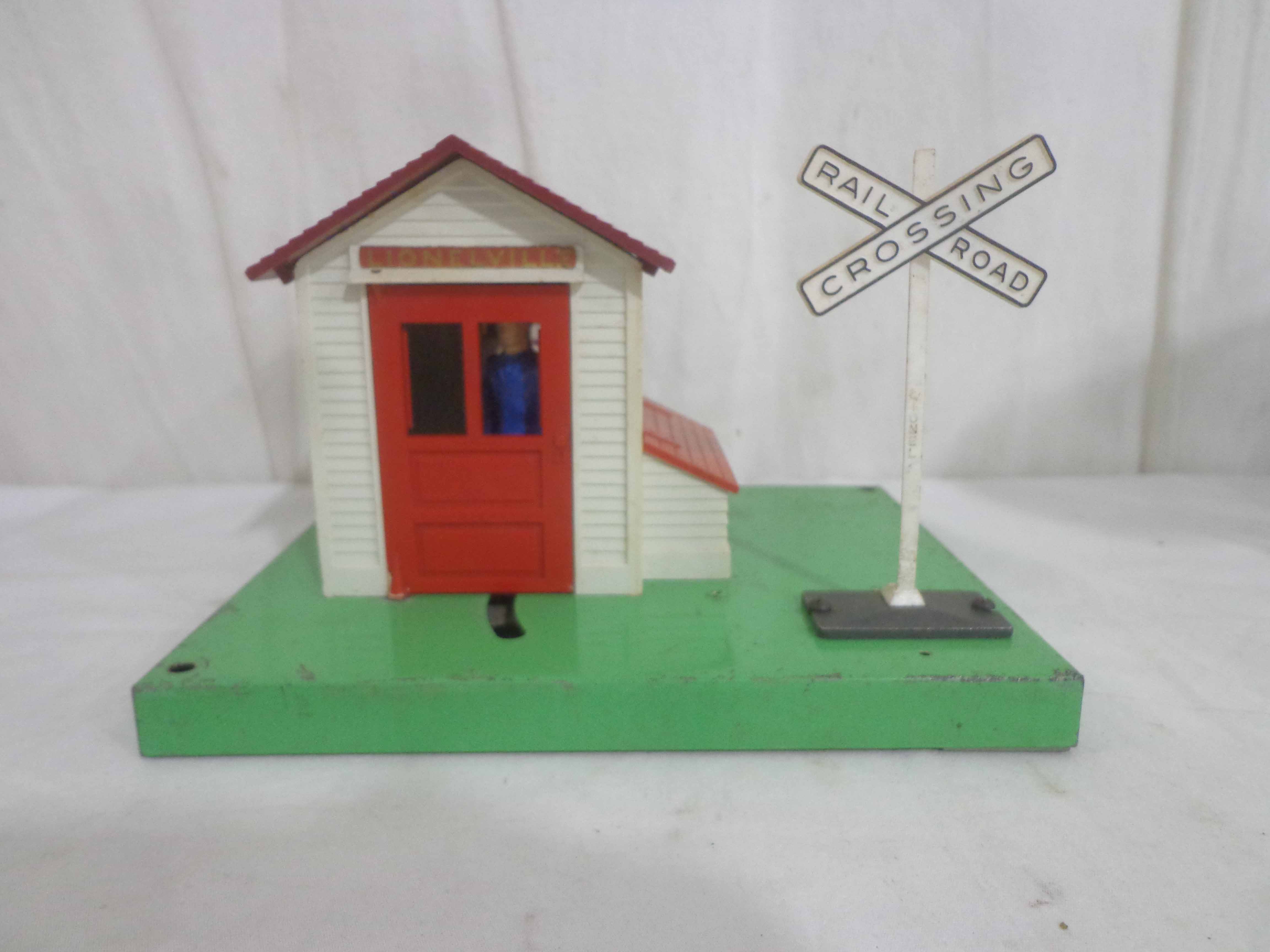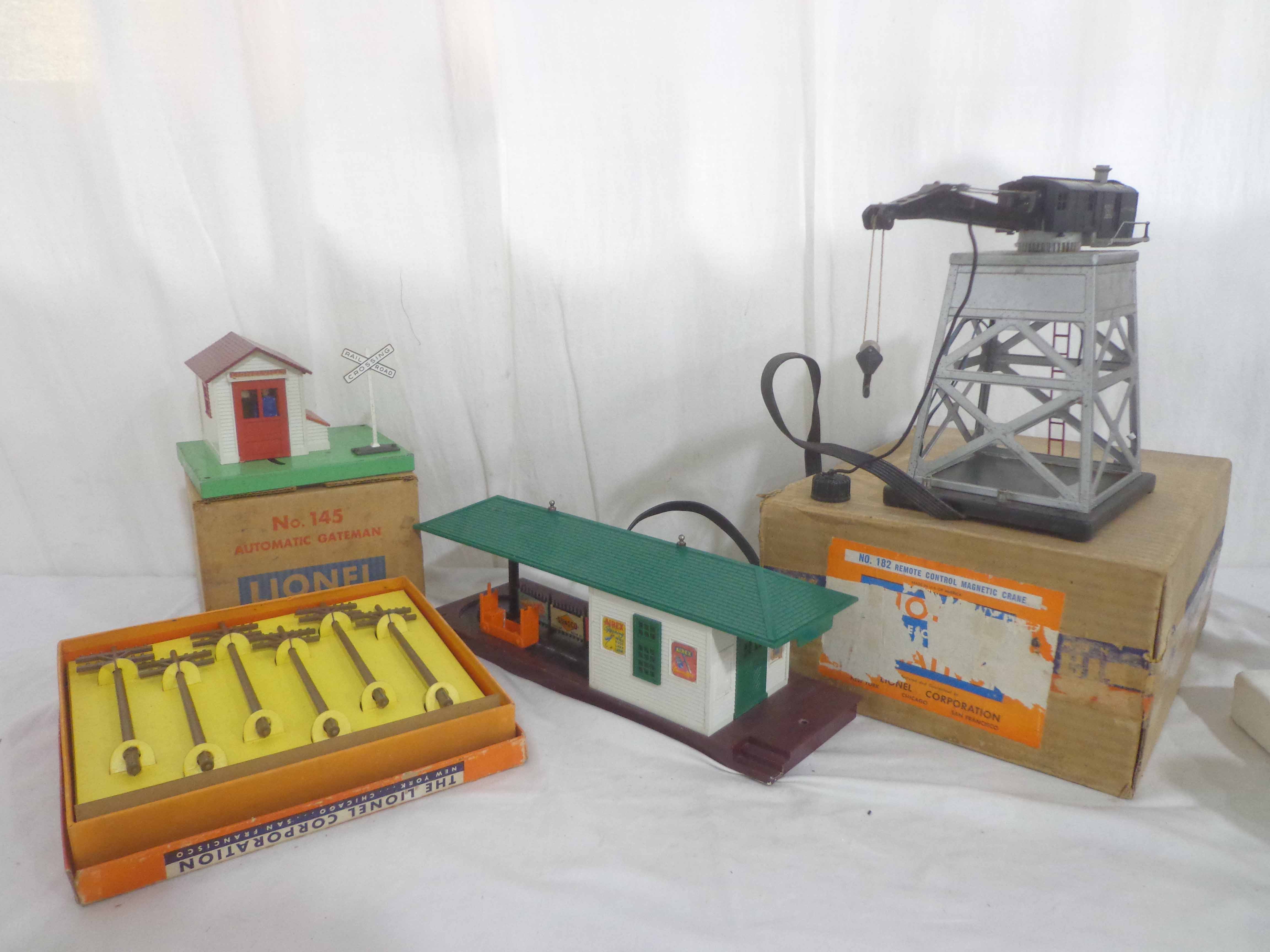 Lionel #145 Automatic Gateman, #182 Remote Control Magnetic Crane, #356 Automatic Freight Station, and #150 Telegraph Pole Set/OBs