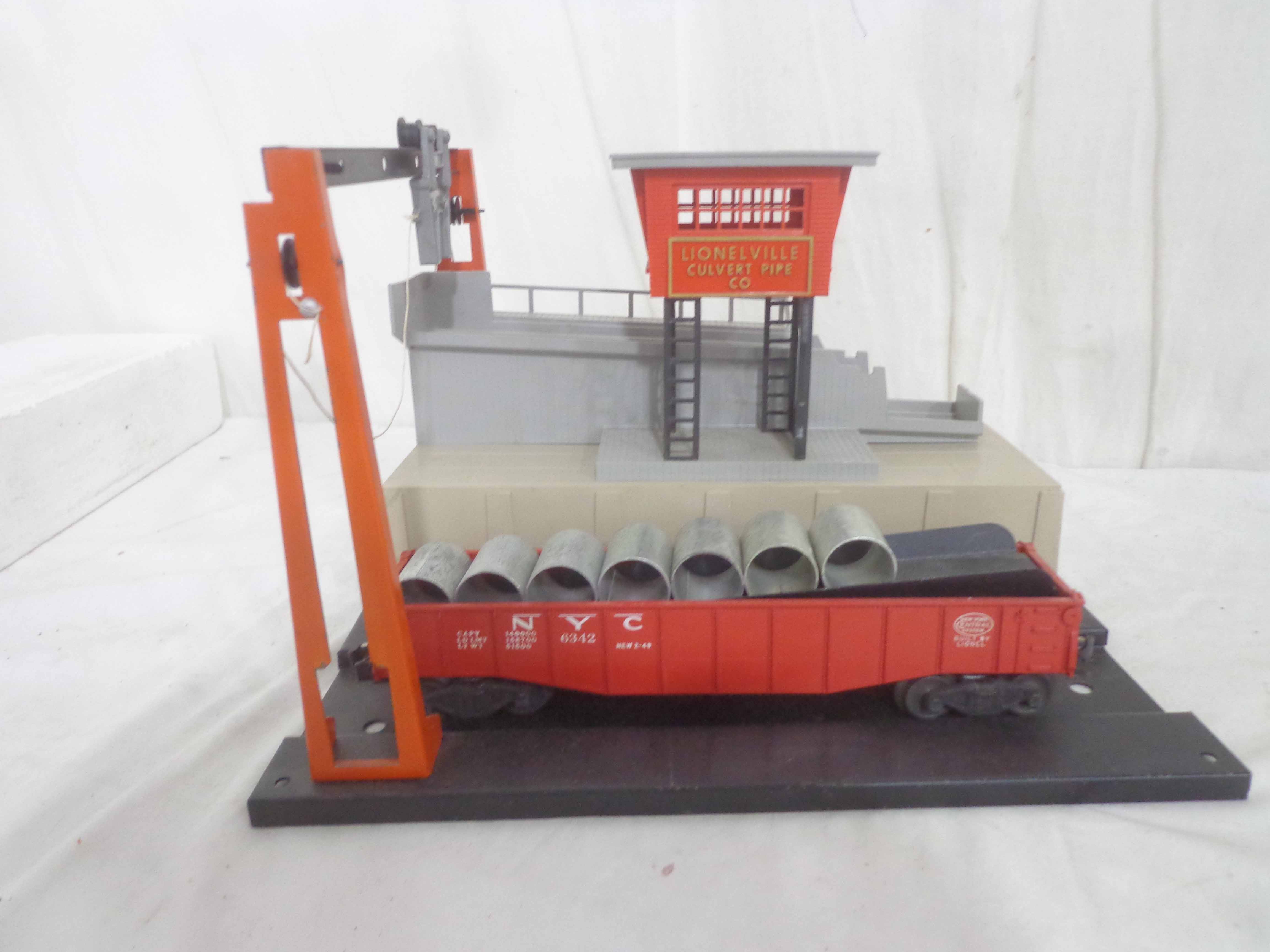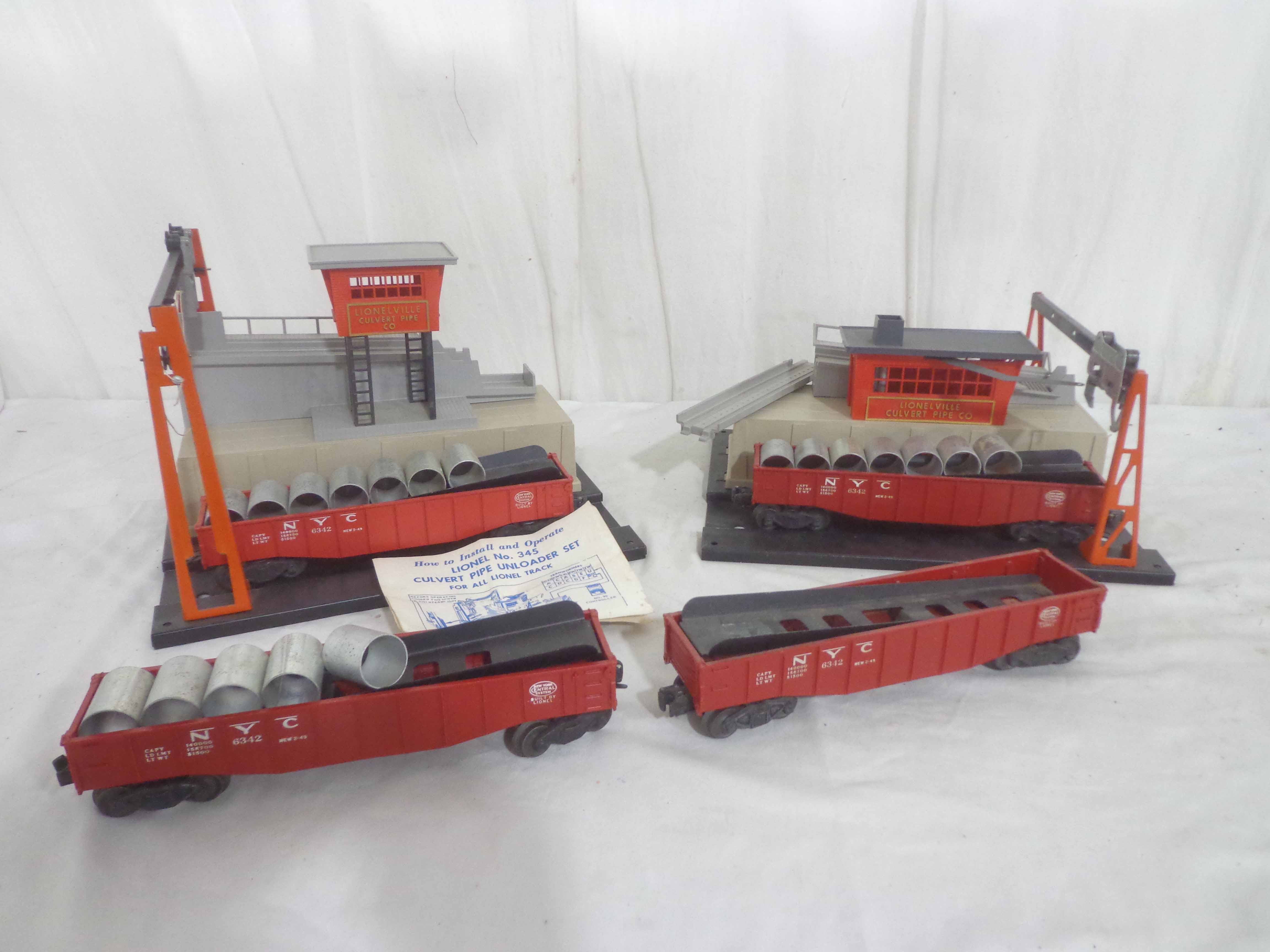 Lionel #342 Culvert Pipe Unloader, #345 Culvert Pipe Loader and 2 Extra #6342 Gondolas