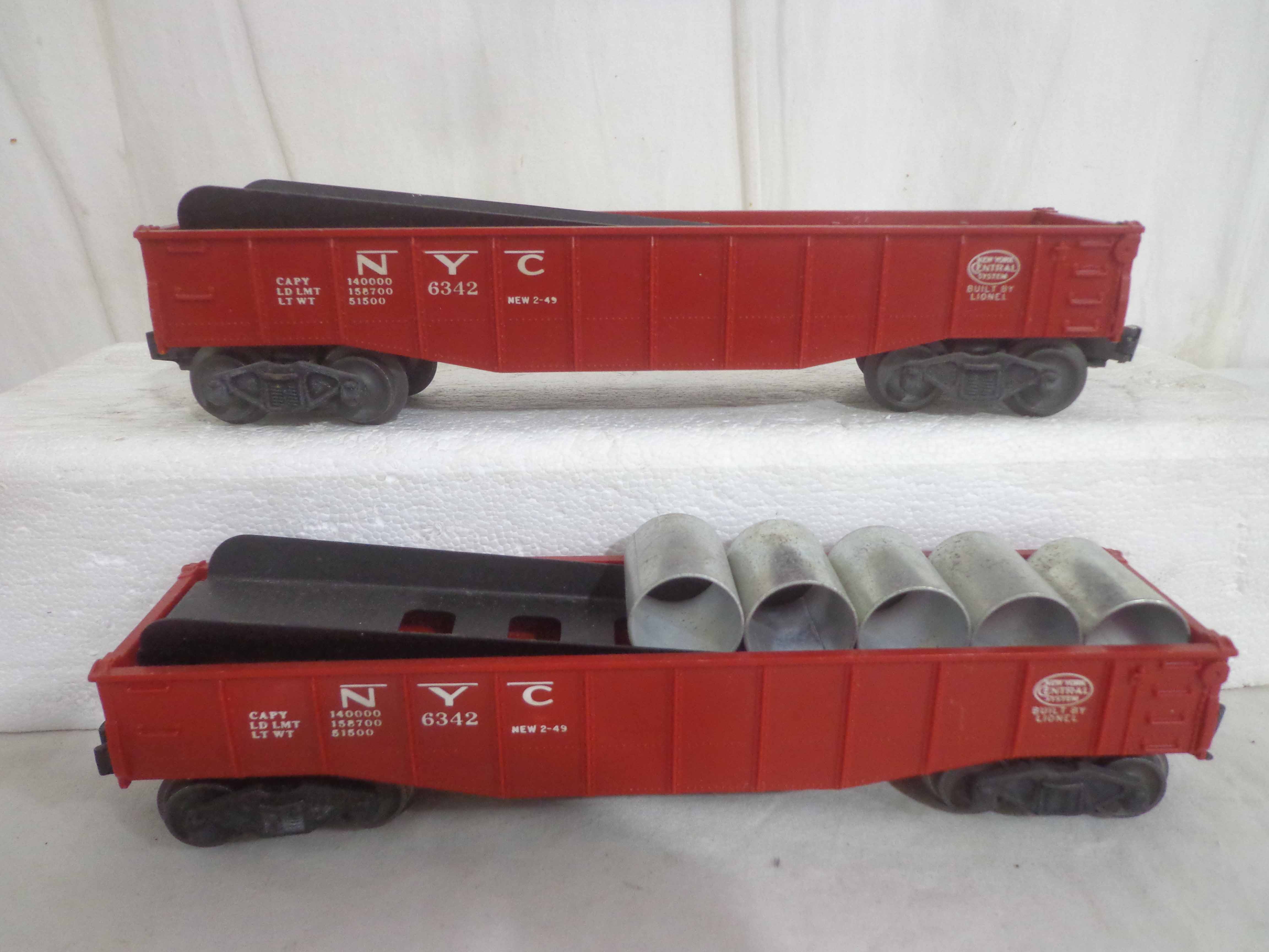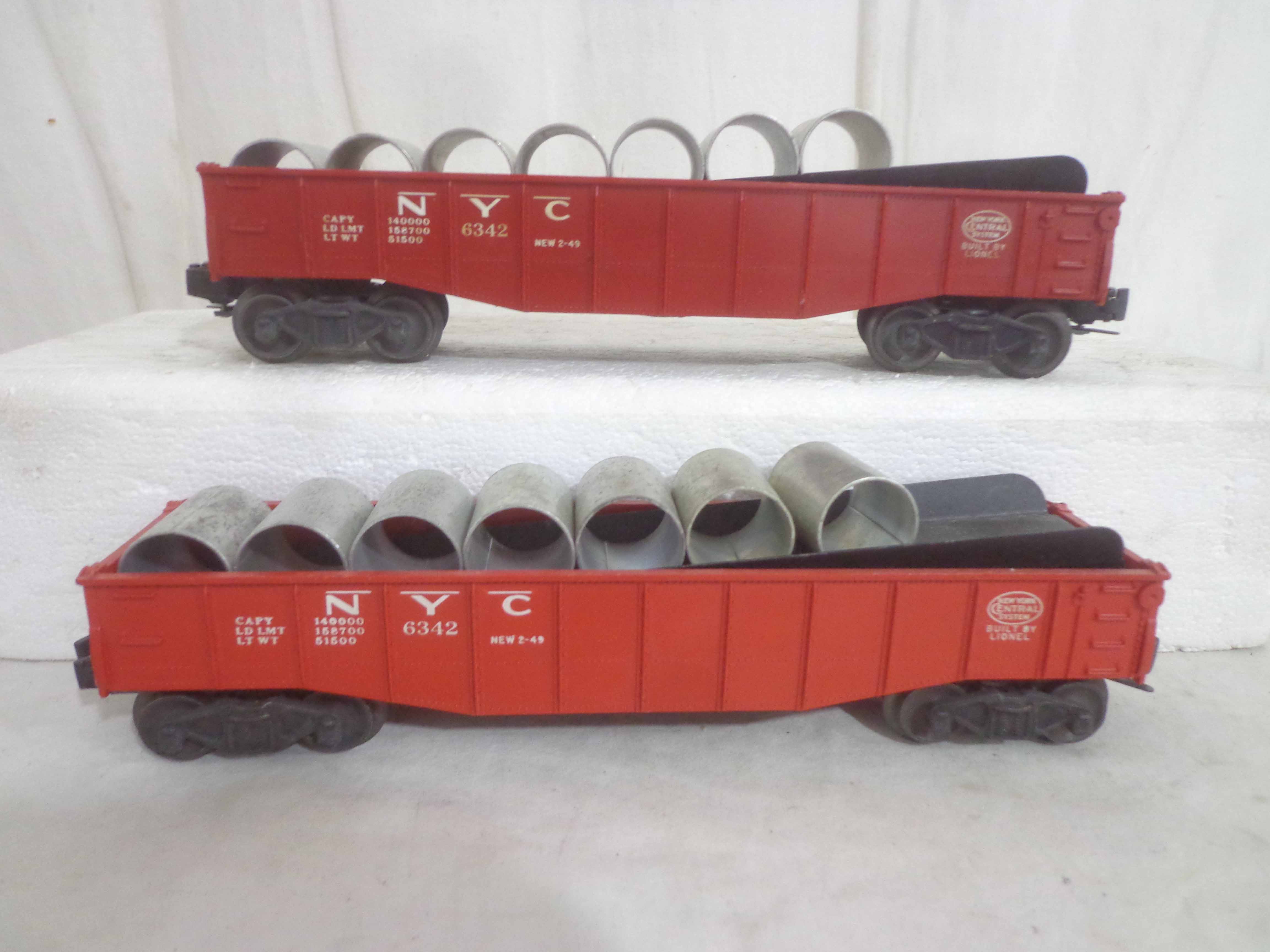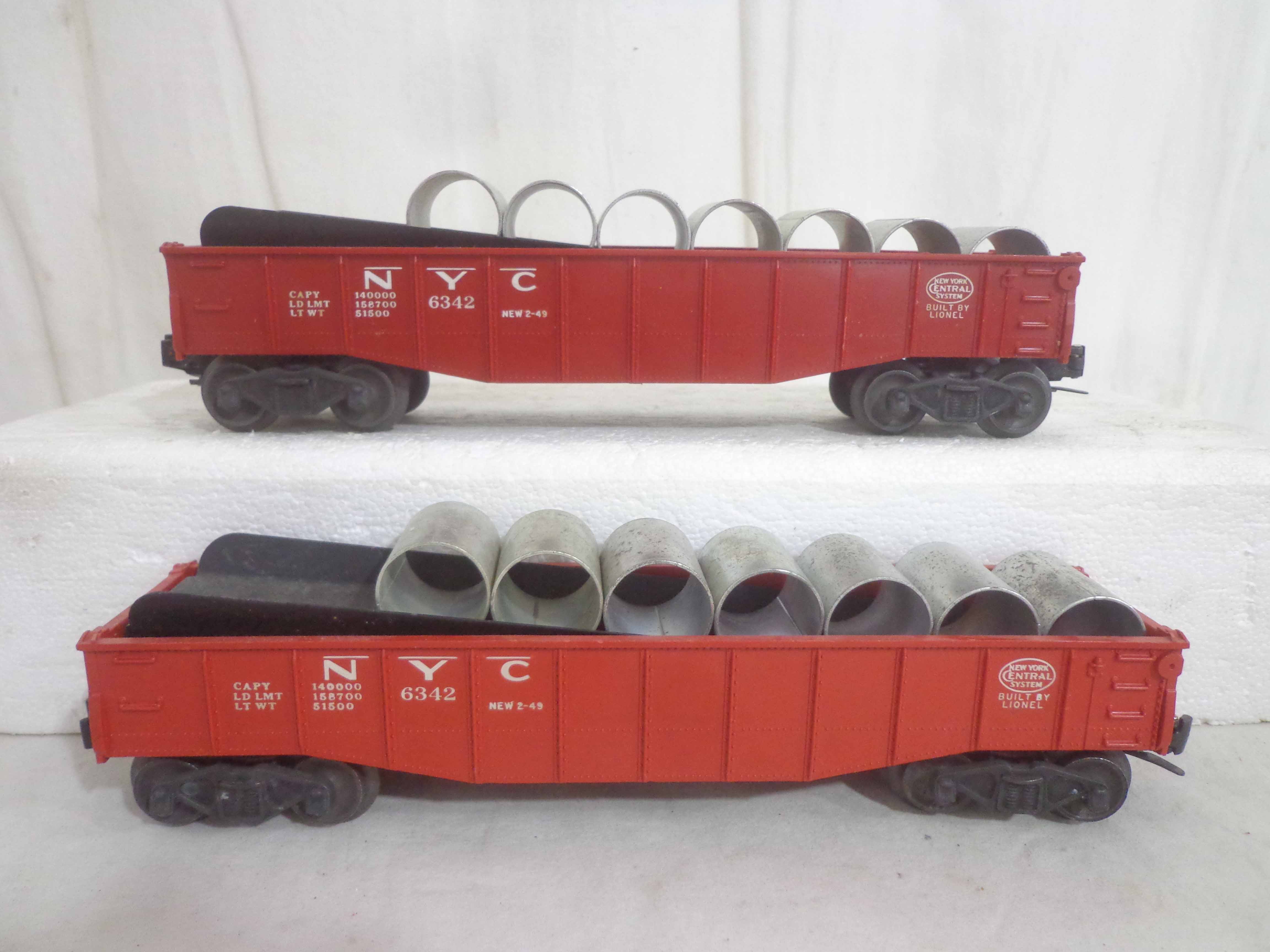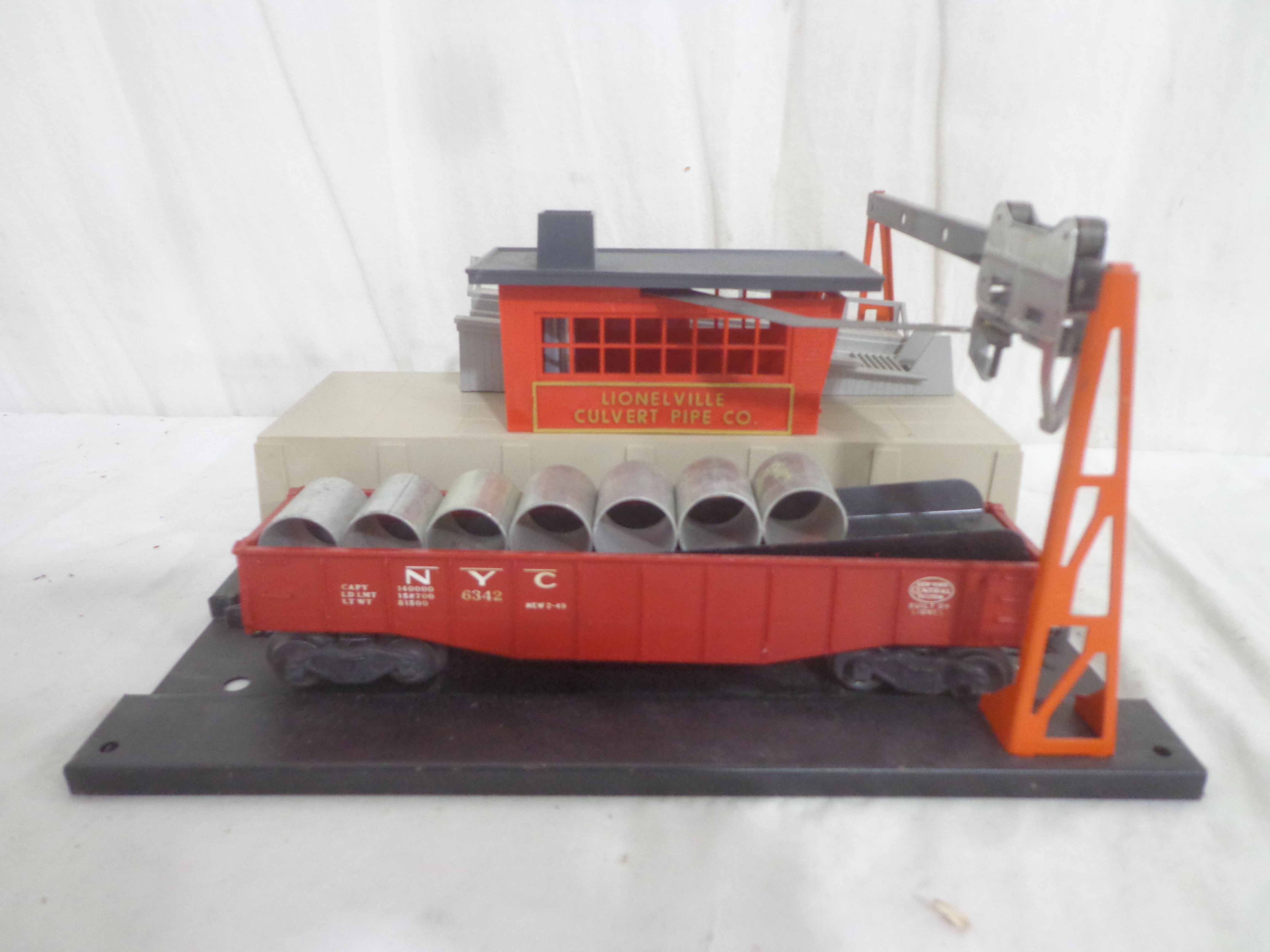These are the #342 Culvert Pipe Unloader, #345 Culvert Pipe Loader and two extra #6342 Gondolas that Lionel made in the past. No Boxes/instructions. Examine closely; what is pictured is what you will receive. Please add $50.00 for US-48 Shipping and Insurance (more west of the Mississippi).