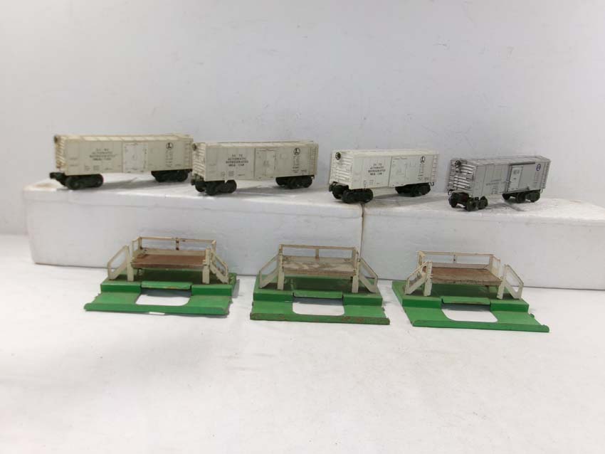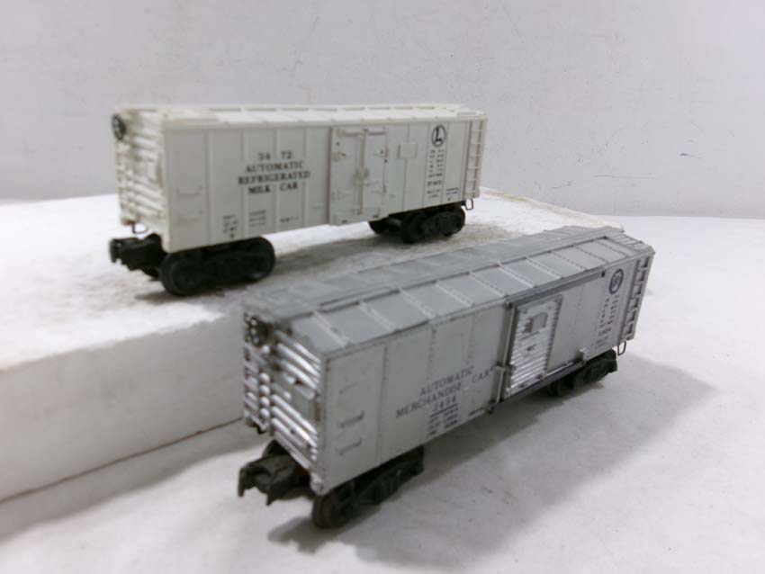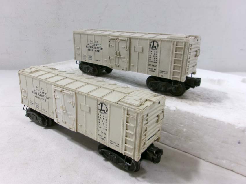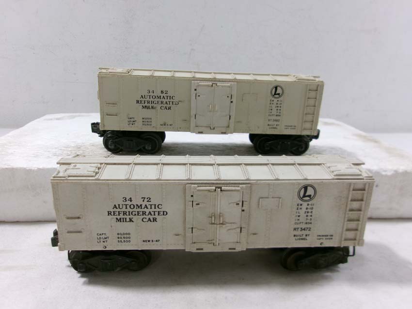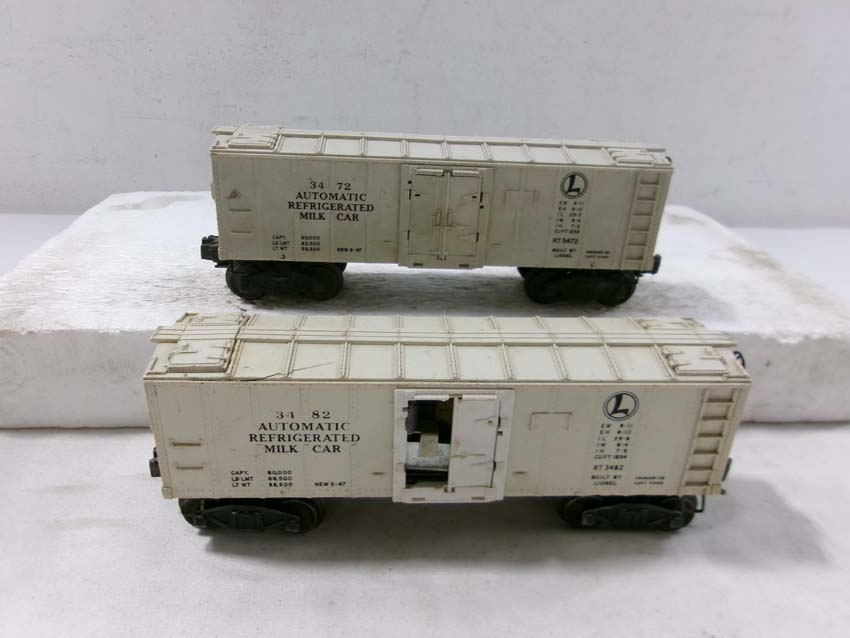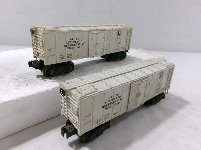These are two #3472 Operating Milk Cars w/Platforms, #3482 Operating Milk Car w/Platform and #3454 PRR Operating Merchandise Car that Lionel made in the past. No Boxes. Examine closely; what is pictured is what you will receive. Please add $45.00 for US-48 Shipping and Insurance (more west of the Mississippi).