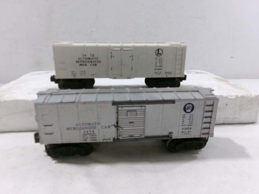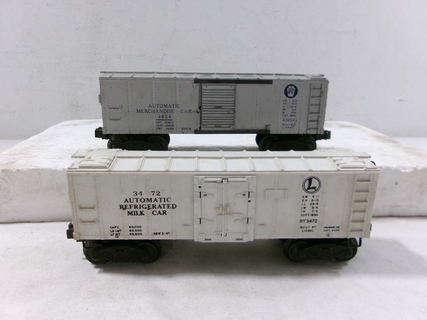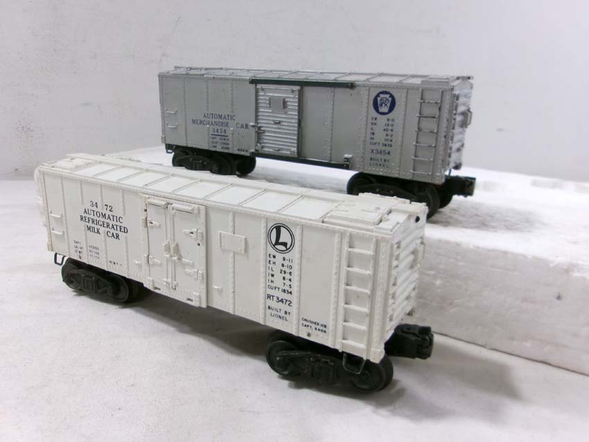 Lionel 2 #3472 Operating Milk Cars w/Platforms, #3482 Operating Milk Car w/Platform and #3454 PRR Operating Merchandise Car