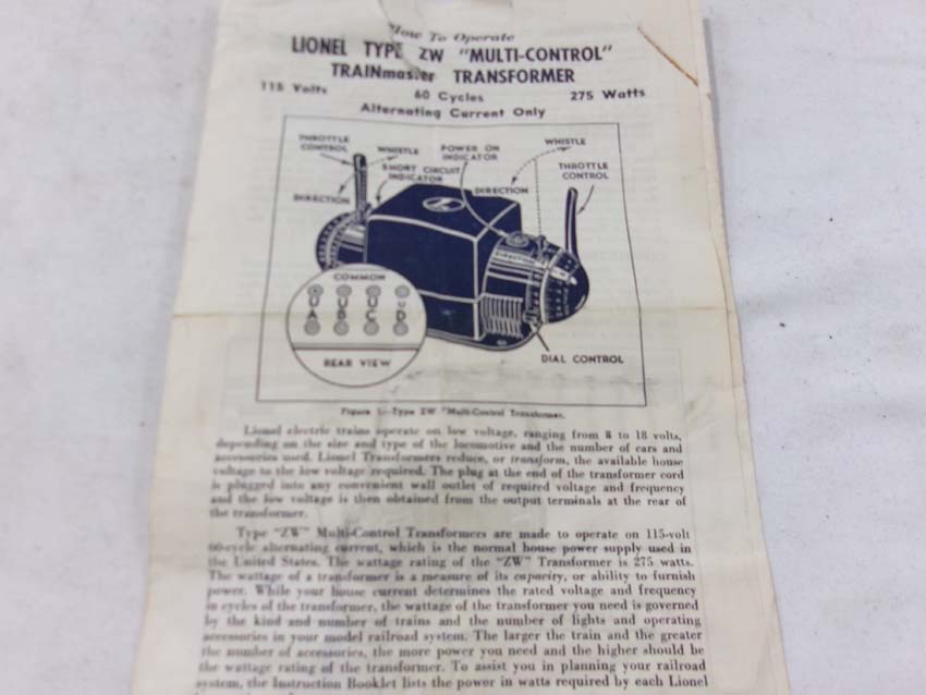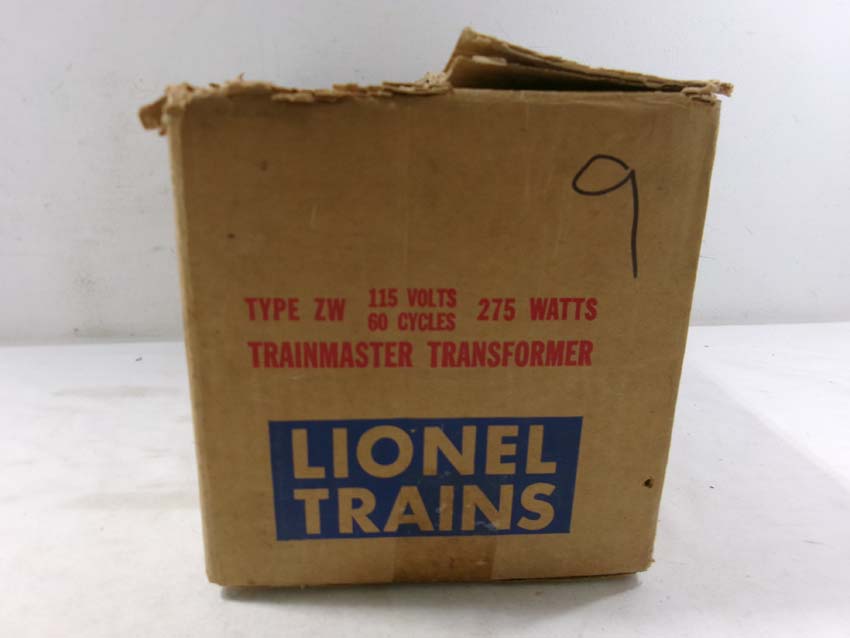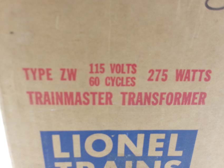 These are two Lionel ZW Transformers (275 watts). Original Box/three inserts. Examine closely; what is pictured is what you will receive. Please add $50.00 for US-48 Shipping and Insurance (more west of the Mississippi). |