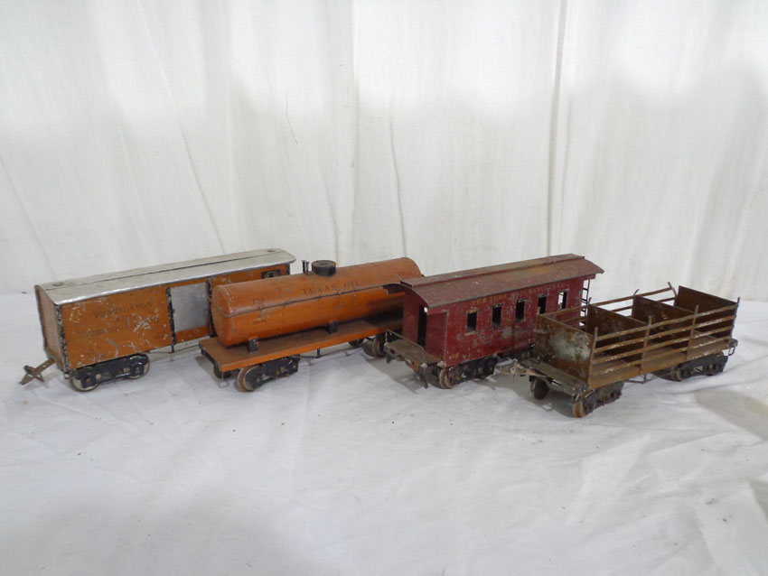 Ives Standard Gauge #190 Texas Oil Tank Car, #191 Pennsylvania Coke Car, #192 Santa Fe Box Car, and #495 Ives Caboose (5 Windows)