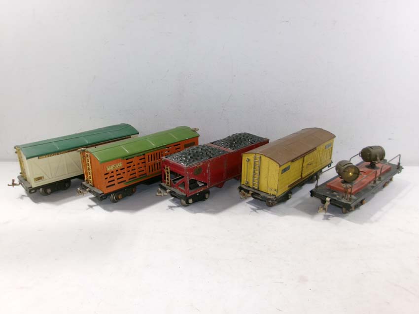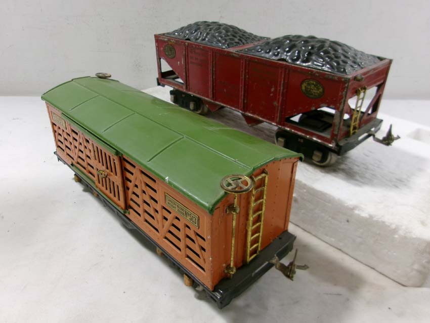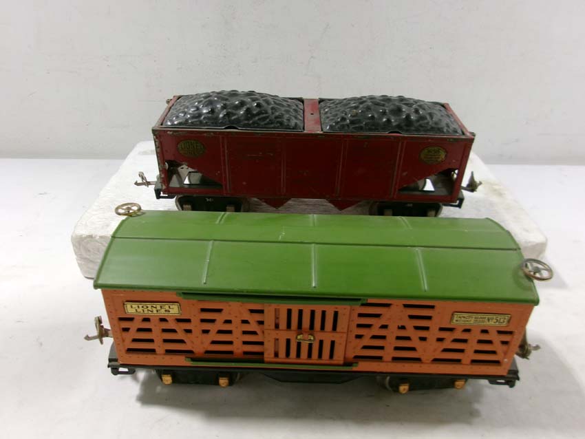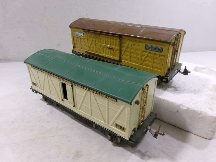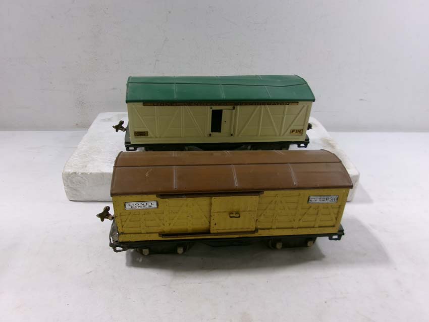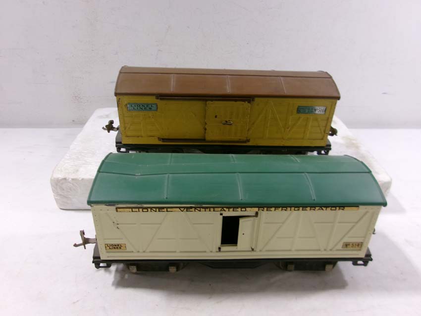 These are the Lionel Standard Gauge #520 Floodlight Car, two #514 Refrigerator Cars, #516 Coal Hopper and #513 Stock Car. No Boxes. Examine closely; what is pictured is what you will receive. Please add $50.00 for US-48 Shipping and Insurance (more west of the Mississippi).