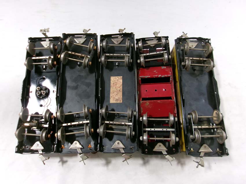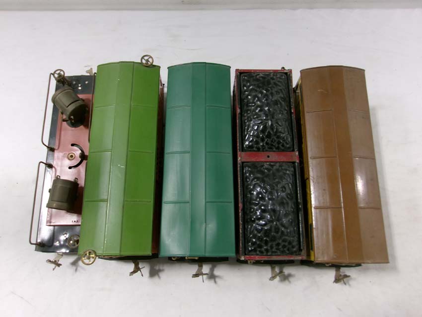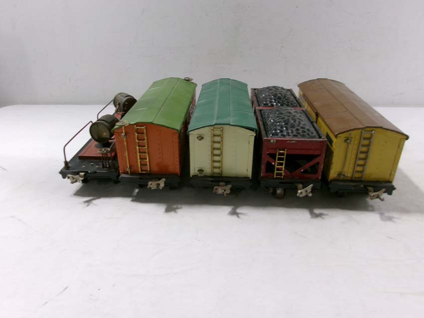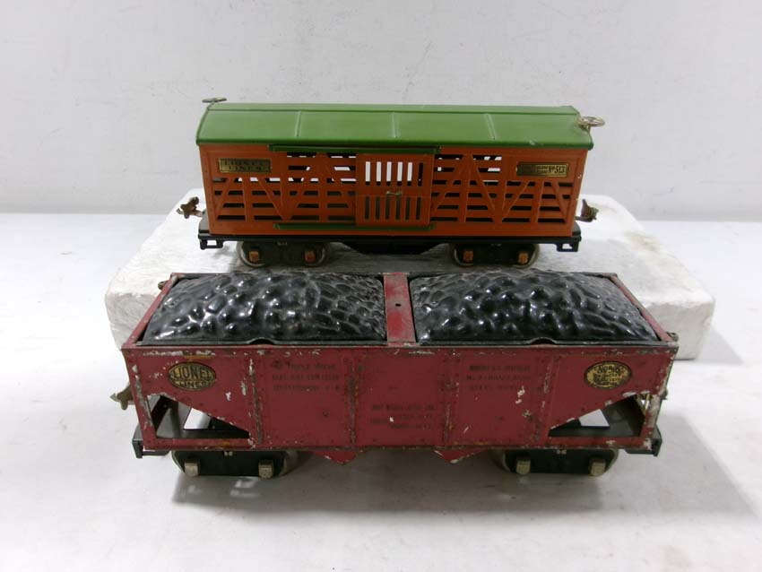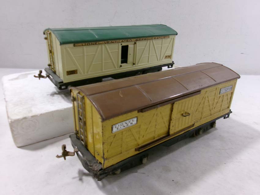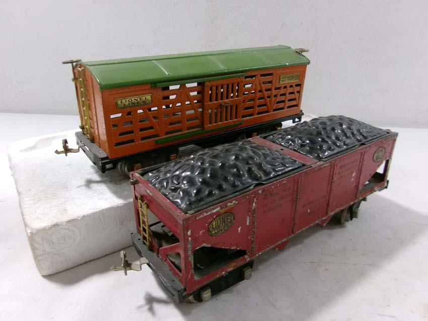 These are the Lionel Standard Gauge #520 Floodlight Car, two #514 Refrigerator Cars, #516 Coal Hopper and #513 Stock Car. No Boxes. Examine closely; what is pictured is what you will receive. Please add $50.00 for US-48 Shipping and Insurance (more west of the Mississippi).