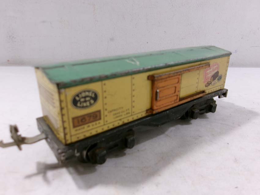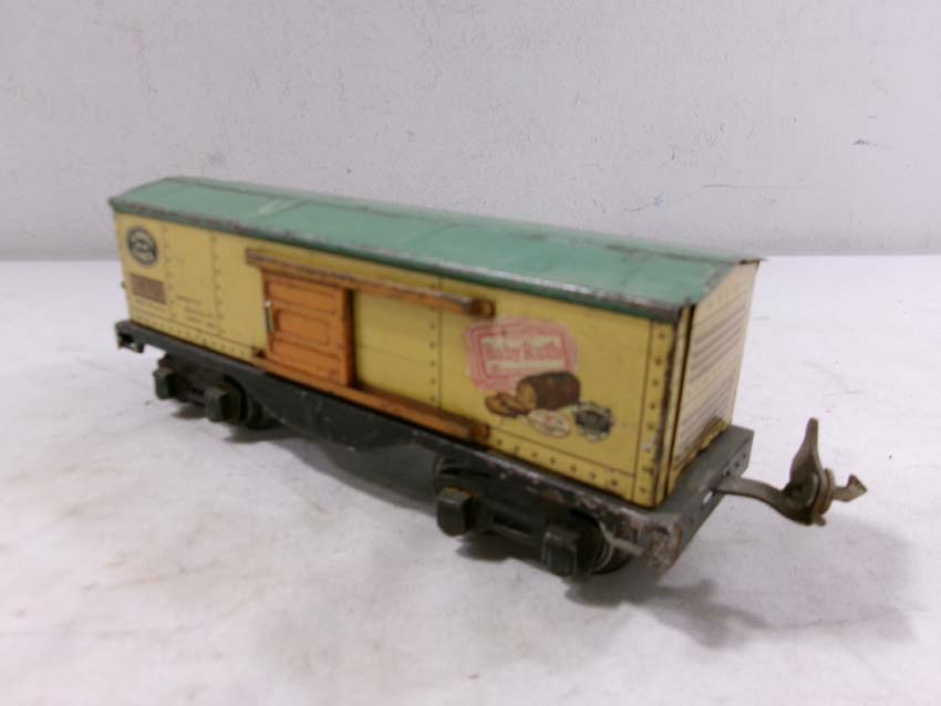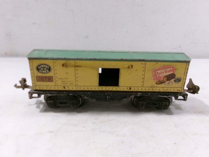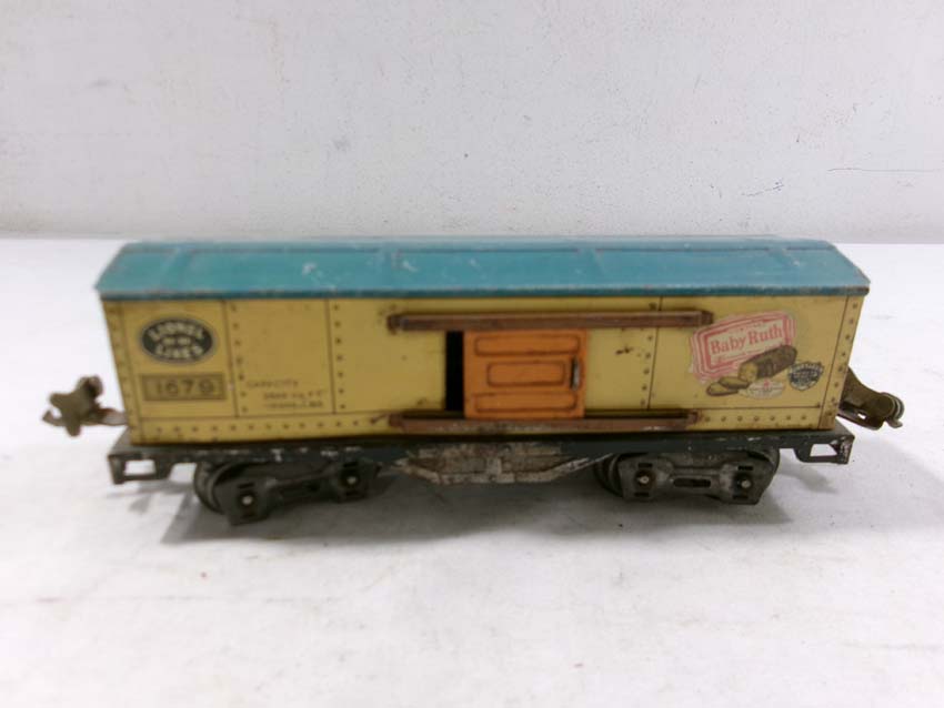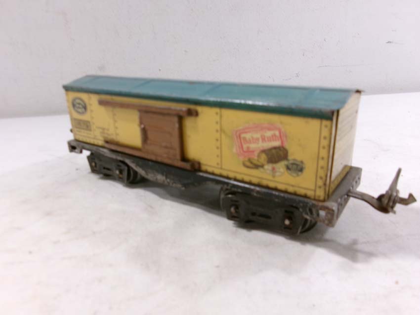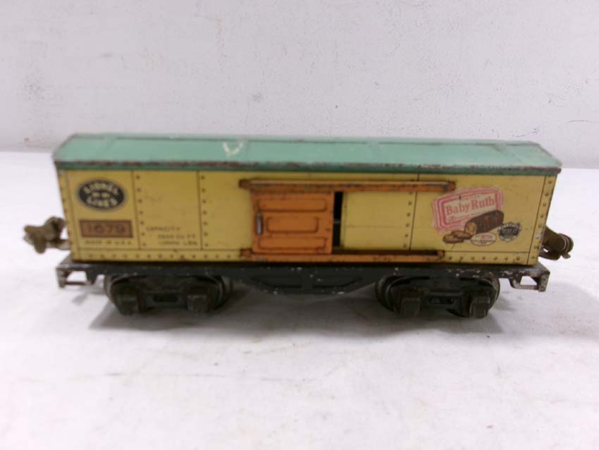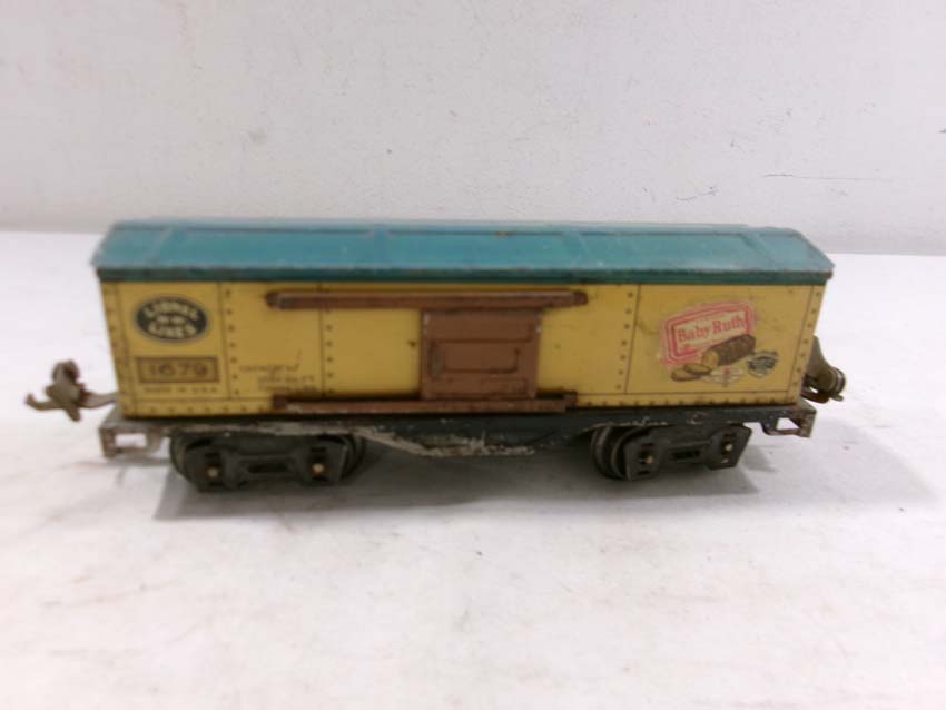 These are two #1679 Baby Ruth Box Cars, 2 #1682 Cabooses and #1017 Transformer Station that Lionel made Pre War. No Boxes. Examine very closely; what is pictured is what you will receive. Please add $45.00 for US-48 Shipping and Insurance (more west of the Mississippi).