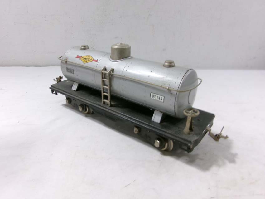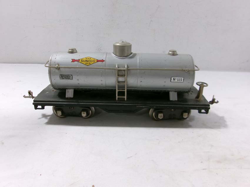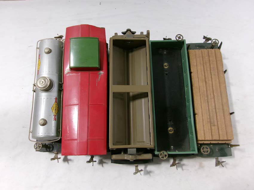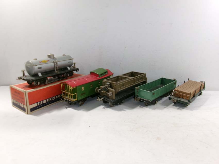Lionel Standard Gauge #515 Sunoco Tank Car, #512 Gondola, #218 Operating Dump Car, #517 Caboose, and #511 Flat Car w/Lumber/OB