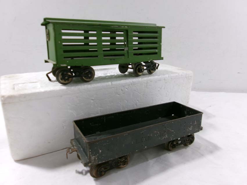 Lionel Standard Gauge #112 Lake Shore Gondola, #113 Cattle Car, #114 CM&StP Box Car, and #117 NYC&HRRR Caboose