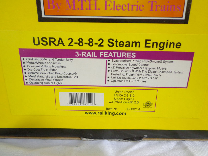 These are the #30-1321-1 Union Pacific USRA 2-8-8-2 Steam Engine and Tender with Proto-Sound that MTH made a few years ago. Our Opinion is that they are generally in Like New Condition. Original Box. All Original in our Opinion. Please add $50.00 for US-48 Shipping and Insurance (more west of the Mississippi).