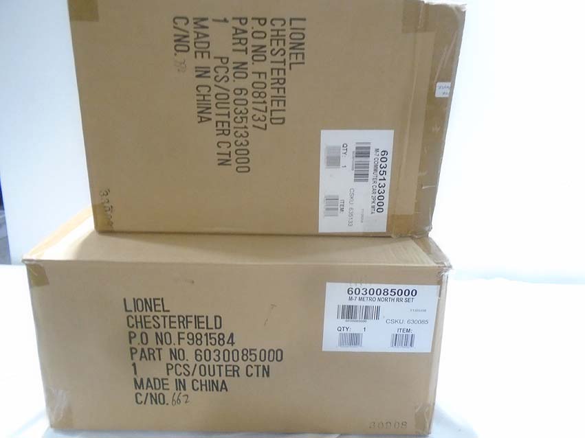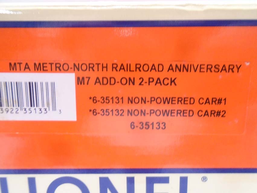 These are the Incomplete #30085 MTA Metro North RR 25th Anniversary M-7 Commuter Train Set (missing transformer) and the #35133 MTA Metro North RR M-7 Add-On 2-Pack that Lionel made a few years ago. Our Opinion is that they are generally in Like New Condition. Original Boxes. Please add $60.00 for US-48 Shipping and Insurance (more west of the Mississippi).