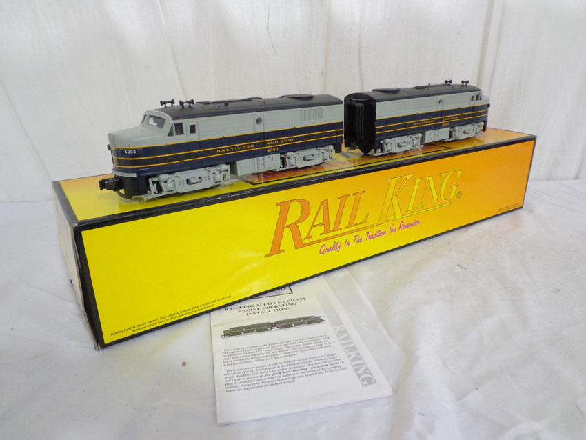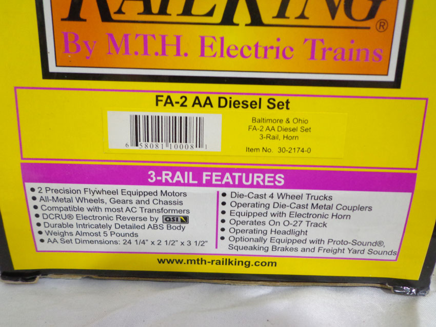 This is the #30-2174-0 Baltimore & Ohio FA-2 AA Diesel Set that MTH made in O Gauge a few years ago. Our Opinion is that the Set is generally in Like New Condition. Original Box. All Original in our Opinion. Please add $45.00 for US-48 Shipping and Insurance (more west of the Mississippi).