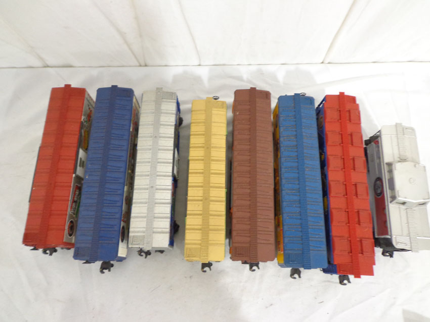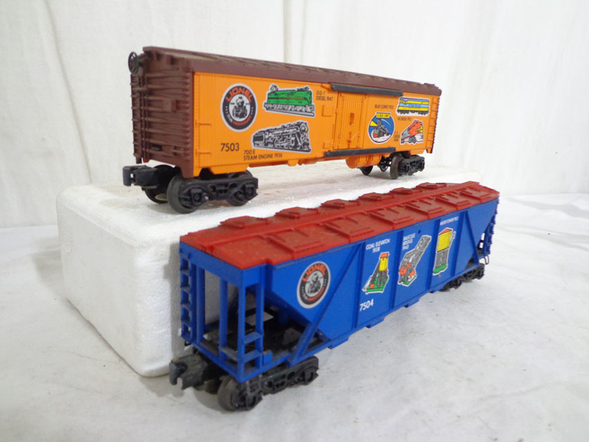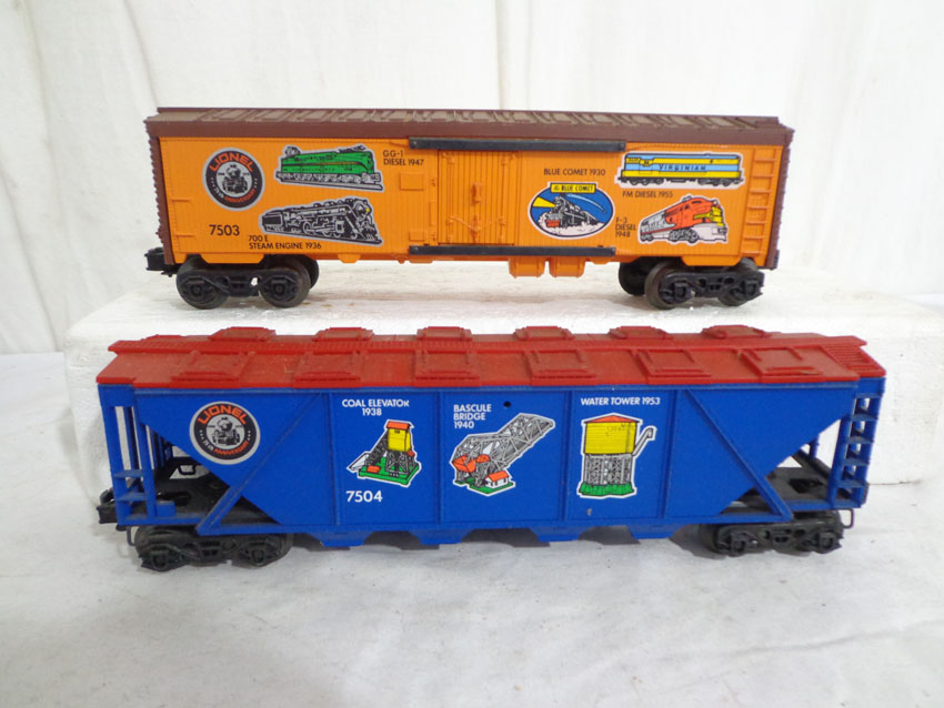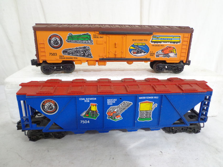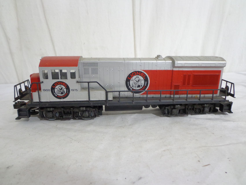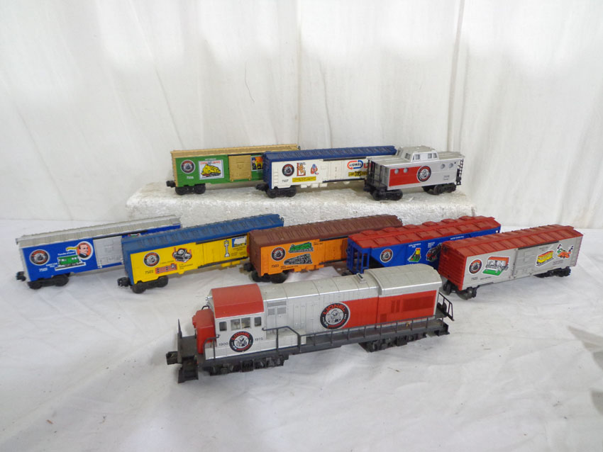 This is the #1585 75th Anniversary Set produced by Lionel circa 1975. This Set includes the #7500 U36B Diesel, the #7506 Famous Catalogs Box Car, the #7505 On-Track Accessories Box Car, the #7501 Founders Box Car, the #7507 Logo Reefer, the #7504 Off-Track Accessories Covered Hopper, the #7502 Famous Engines Reefer Car, the #7503 Innovations Reefer Car and the #7508 N5C Caboose. Our Opinion is that the Set is generally in Excellent Condition. No Boxes. Examine closely; what is pictured is what you will receive. Please add $50.00 for US-48 Shipping and Insurance (more west of Mississippi).