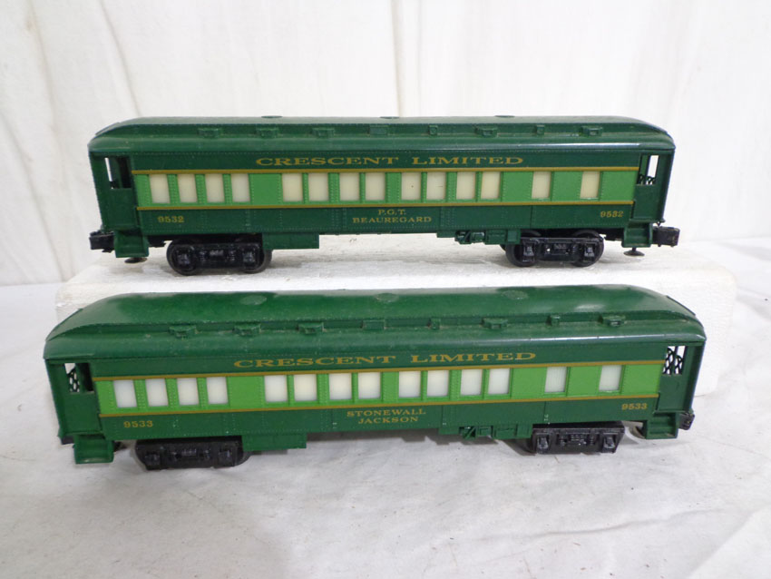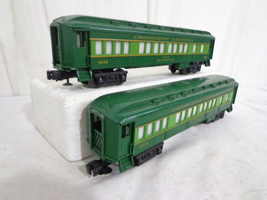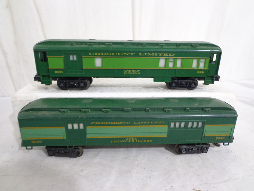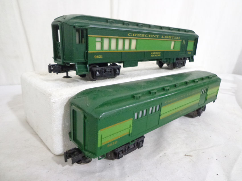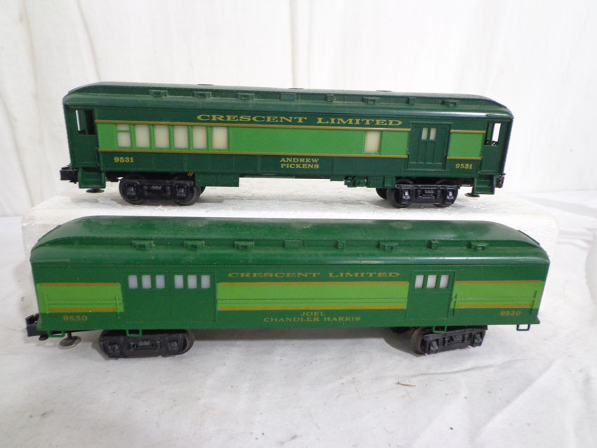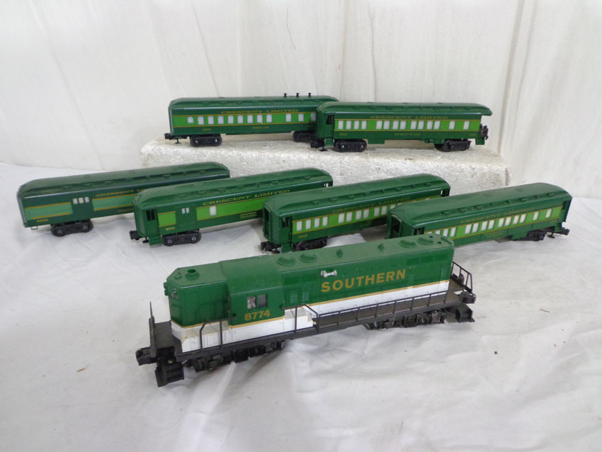 These are the #8774 Southern Crescent GP-7 Diesel Engine and the #9530/9531/9532/9533/9534/19001 Passenger Cars that Lionel made in the 1970s/80s. Our Opinion is that they are generally in Like New Minus Condition. Original Boxes. All Original in our Opinion. Please add $50.00 for US-48 Shipping and Insurance (more west of the Mississippi).