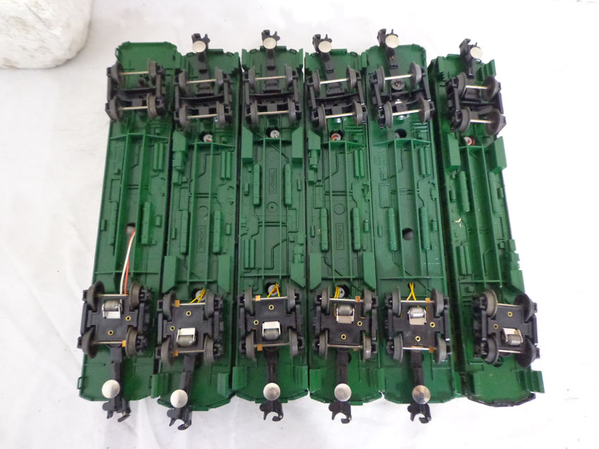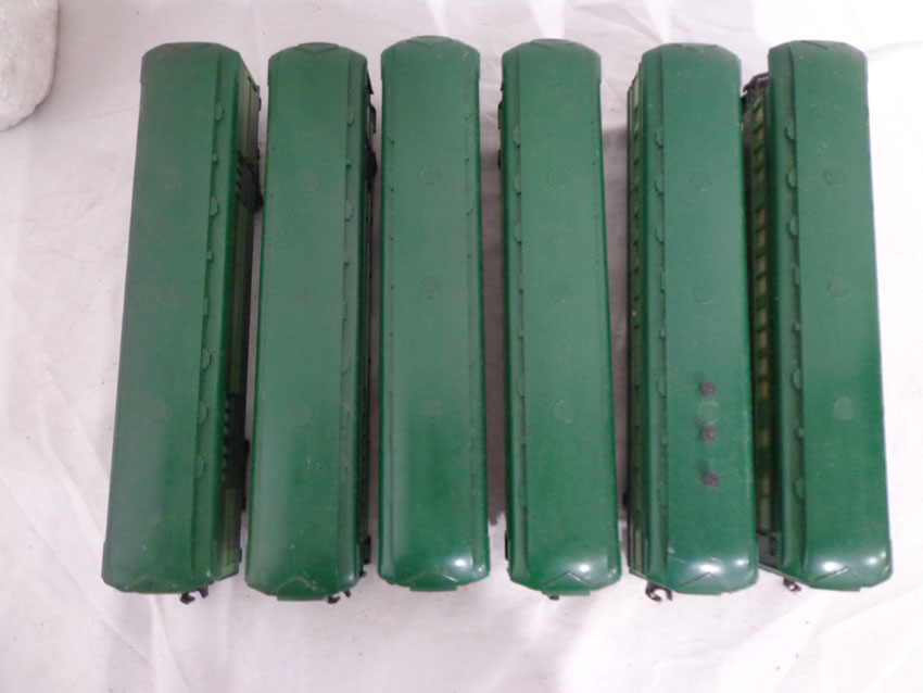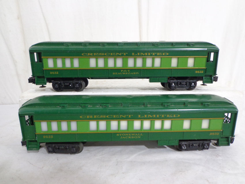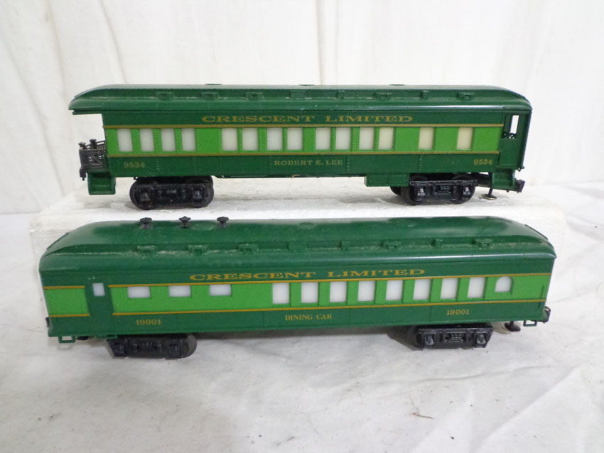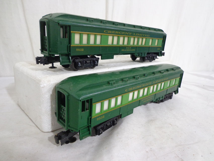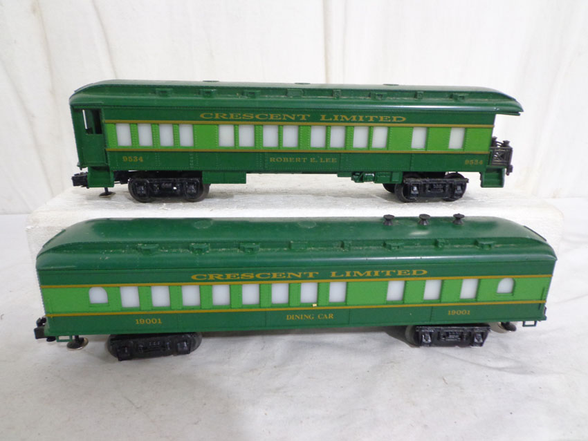 These are the #8774 Southern Crescent GP-7 Diesel Engine and the #9530/9531/9532/9533/9534/19001 Passenger Cars that Lionel made in the 1970s/80s. Our Opinion is that they are generally in Like New Minus Condition. Original Boxes. All Original in our Opinion. Please add $50.00 for US-48 Shipping and Insurance (more west of the Mississippi).