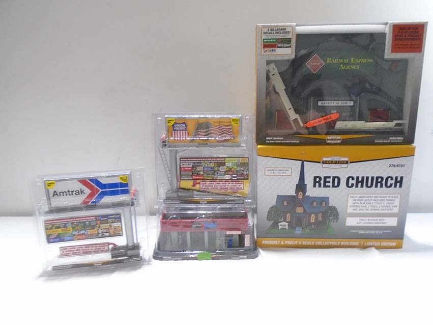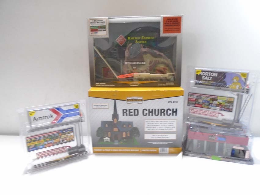 These are the #279-6151 Red Church, the #279-5370 Warehouse Background Building, the #279-4289/279-3693 Billboards, and the #279-4523 Amtrak Station that Menards made a few years ago. Our Opinion is that they are generally in Mint Condition. Original Box/Blister Packs. All Original in our Opinion. Please add $50.00 for US-48 Shipping and Insurance (more west of the Mississippi).