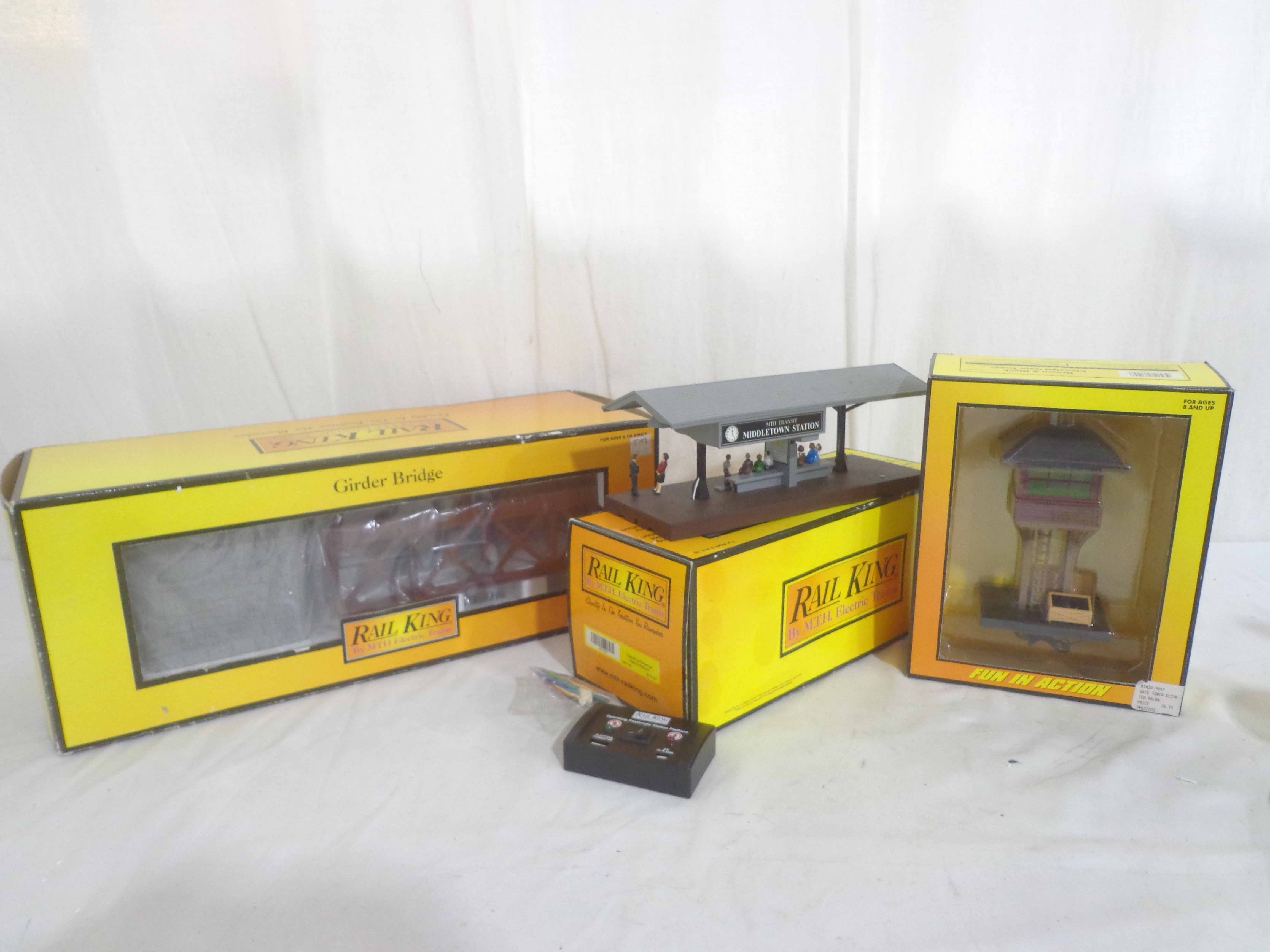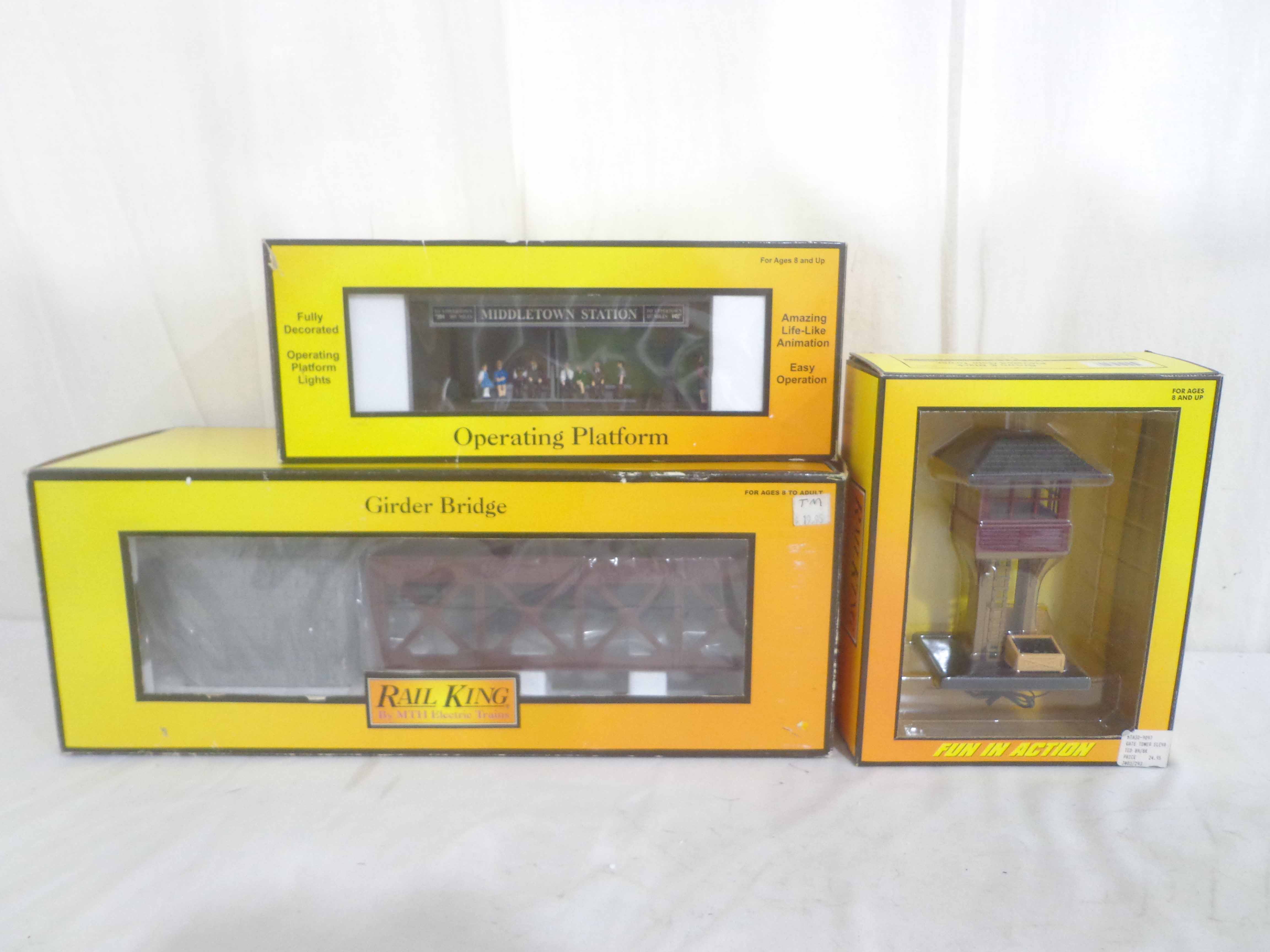 These are the #30-9107 Operating Passenger Station Platform, the #30-9097 Elevated Gate Tower, and the #40-1032 Rust Girder Bridge that MTH made a few years ago. Our Opinion is that they are generally in Mint Condition. Original Boxes. All Original in our Opinion. Please add $50.00 for US-48 Shipping and Insurance (more west of the Mississippi).