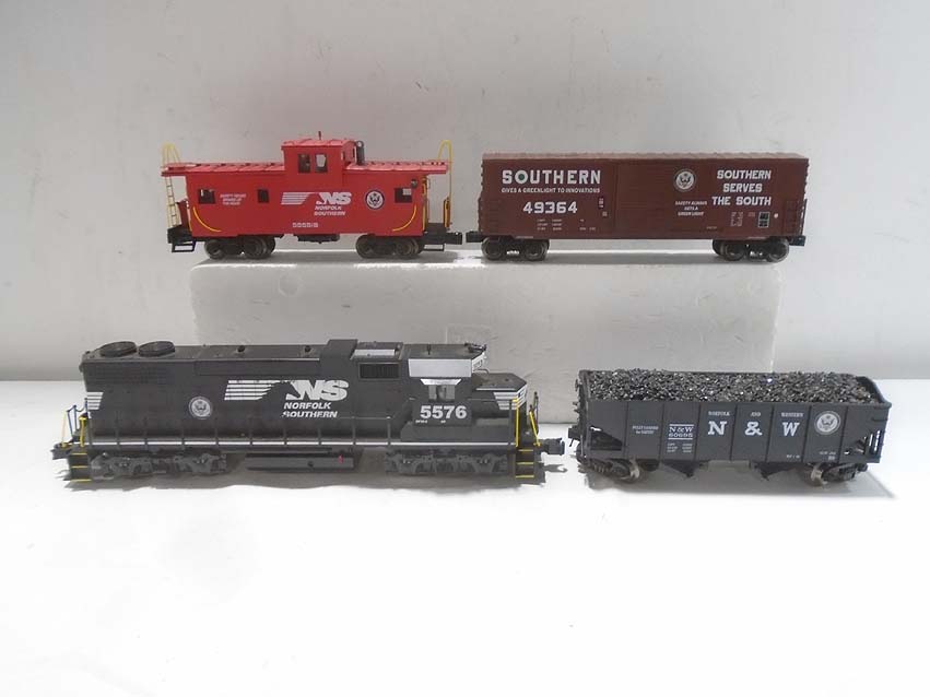 These are the NS #5576 Diesel Engine, the #60695 Hopper, the #49364 Box Car, and the #555518 Caboose that K-Line made a few years ago. Our Opinion is that they are generally in Excellent or Better Condition. No Boxes. Examine closely; what is pictured is what you will receive. Please add $45.00 for US-48 Shipping and Insurance (more west of the Mississippi).