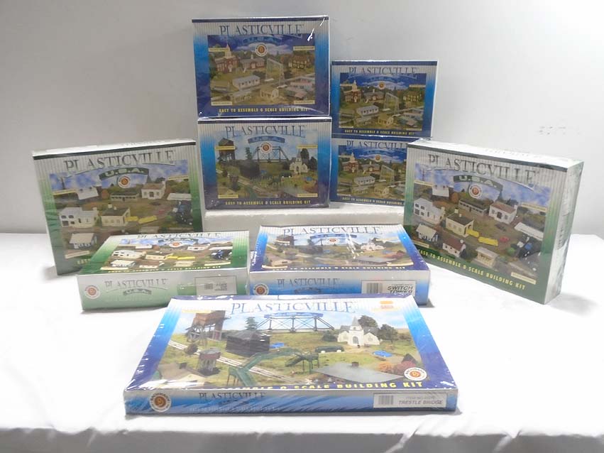 These are nine Assorted Building Kits that Bachmann/Plasticville madea few years ago. Our Opinion is that they are generally in Mint Condition. Original Boxes SEALED. Examine closely; what is pictured is what you will receive. Please add $45.00 for US-48 Shipping and Insurance (more west of the Mississippi).
