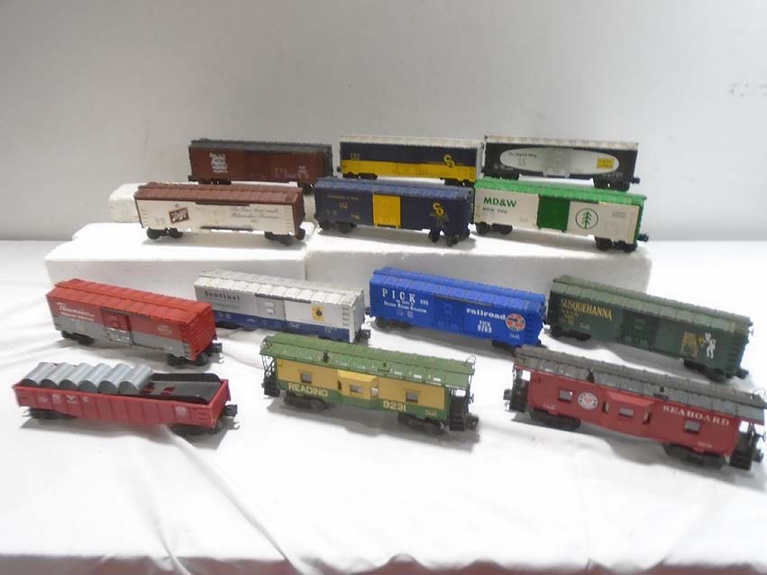 These are thirteen Assorted Freight Cars and Cabooses that Lionel made a few years ago. Our Opinion is that they are generally in Excellent Minus Condition. No Boxes Examine closely; what is pictured is what you will receive. Please add $50.00 for US-48 Shipping and Insurance (more west of the Mississippi).